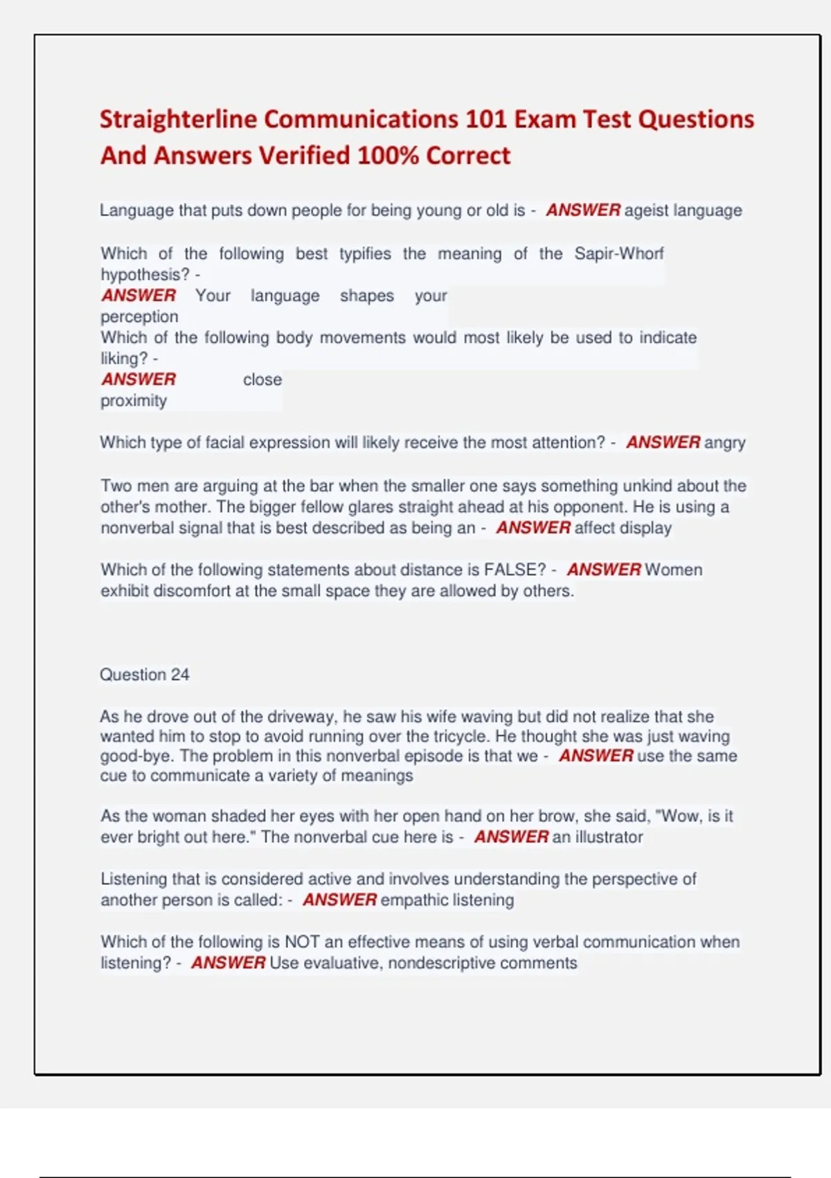 Straighterline Communications 101 Exam Test Questions And Answers Verified 100% Correct Language that puts down people for being young or old is - ANSWER ageist language Which of the following best typifies the meaning of the Sapir-Whorf hypothesis? - ANSWER Your language shapes your perception Which of the following body movements would most likely be used to indicate liking? - ANSWER close proximity Which type of facial expression will likely receive the most attention? - ANSWER angry Two men are arguing at the bar when the smaller one says something unkind about the other's mother. The bigger fellow glares straight ahead at his opponent. He is using a nonverbal signal that is best described as being an - ANSWER affect display Which of the following statements about distance is FALSE? - ANSWER Women exhibit discomfort at the small space they are allowed by others. Question 24 As he drove out of the driveway, he saw his wife waving but did not realize that she wanted him to stop to avoid running over the tricycle. He thought she was just waving good-bye. The problem in this nonverbal episode is that we - ANSWER use the same cue to communicate a variety of meanings As the woman shaded her eyes with her open hand on her brow, she said, "Wow, is it ever bright out here." The nonverbal cue here is - ANSWER an illustrator Listening that is considered active and involves understanding the perspective of another person is called: - ANSWER empathic listening Which of the following is NOT an effective means of using verbal communication when listening? - ANSWER Use evaluative, nondescriptive comments Which two concepts seem most closely related? - ANSWER egocentrism and personal bias Which of the following is a limitation of short-term memory? - ANSWER can only hold five to nine "bits" of information on average Children with higher levels of language development are more likely to - ANSWER have more efficient working memory College students spend approximately what proportion of their time listening to others and the mass media? - ANSWER 50% Which of the following is not necessarily part of the process of listening? - ANSWER Tinnitus is something that would be most likely to affect your - ANSWER hearing Which of the following is an example of hearing rather than listening? - ANSWER The sound of firecrackers filled the nighttime air Empathic listening differs from active listening in that - ANSWER empathic listening adds the goal of understanding. Which of the following is essential to demonstrating active listening? - ANSWER Sit or stand so you are directly facing the speaker "You need to remember this because it will be on the quiz." What type of lecture cue is this statement? - ANSWER importance When you paraphrase the speaker's message and intent, ask questions, or invite corrections, you are - ANSWER checking your understanding or perception of the speaker Which of the following is an example of a physical distraction to listening? - ANSWER "The two people talking in the row ahead of me kept me from catching very much of his lecture." Which of the following is an inference? - ANSWER The road appears dangerous for ordinary travel. A relationship in which the two people are very similar is called - ANSWER a symmetrical relationship Which association is NOT part of the textbook definition of interpersonal relationships? - ANSWER one between two or more people who exhibit affection toward each other Iakopa is good at writing and understanding literature; Marian is a whiz at math and statistics; together they make a great pair. The concept of friendship illustrated here is - ANSWER complementarity What is one strategy for appropriate self-disclosure in interpersonal relationships? - ANSWER Reveal information to others as they reveal information to you. In relationships, formalized patterns of actions or words that are followed regularly and are indicators of relational uniqueness are called - ANSWER rituals Grayson doesn't talk about his parents' divorce with his girlfriend because it is still a painful subject to discuss. What factor affecting self-disclosure can be identified here? - ANSWER Disclosure might be avoided for a variety of reasons Which of the following is NOT one of the three stages in interpersonal relationships? - ANSWER social penetration In which stage of how friends develop do people think of themselves as friends and begin to establish their own private ways of interacting? - ANSWER nascent friendship Relationships in which the two people are not romantically involved but have a sexual relationship are called - ANSWER friends with benefits Rashi and Anita marry because they are of the same cultural background. This is most likely what type of relationship? - ANSWER symmetrical The word communication comes from the Latin communicare, which means - ANSWER "to make common." Which of the following is NOT a component of communication? - ANSWER action James is at home watching a politically oriented discussion show on cable TV. One of the commentators is making arguments that are faulty, which makes James very angry. But James cannot express that to the commentator on TV. James is feeling the frustrations of which context of communication? - ANSWER mass context Dyadic and small-group communication are two subsets of: - ANSWER interpersonal communication Saying "uh huh" to indicate you understand is using what is classified as a - ANSWER nonverbal code.
