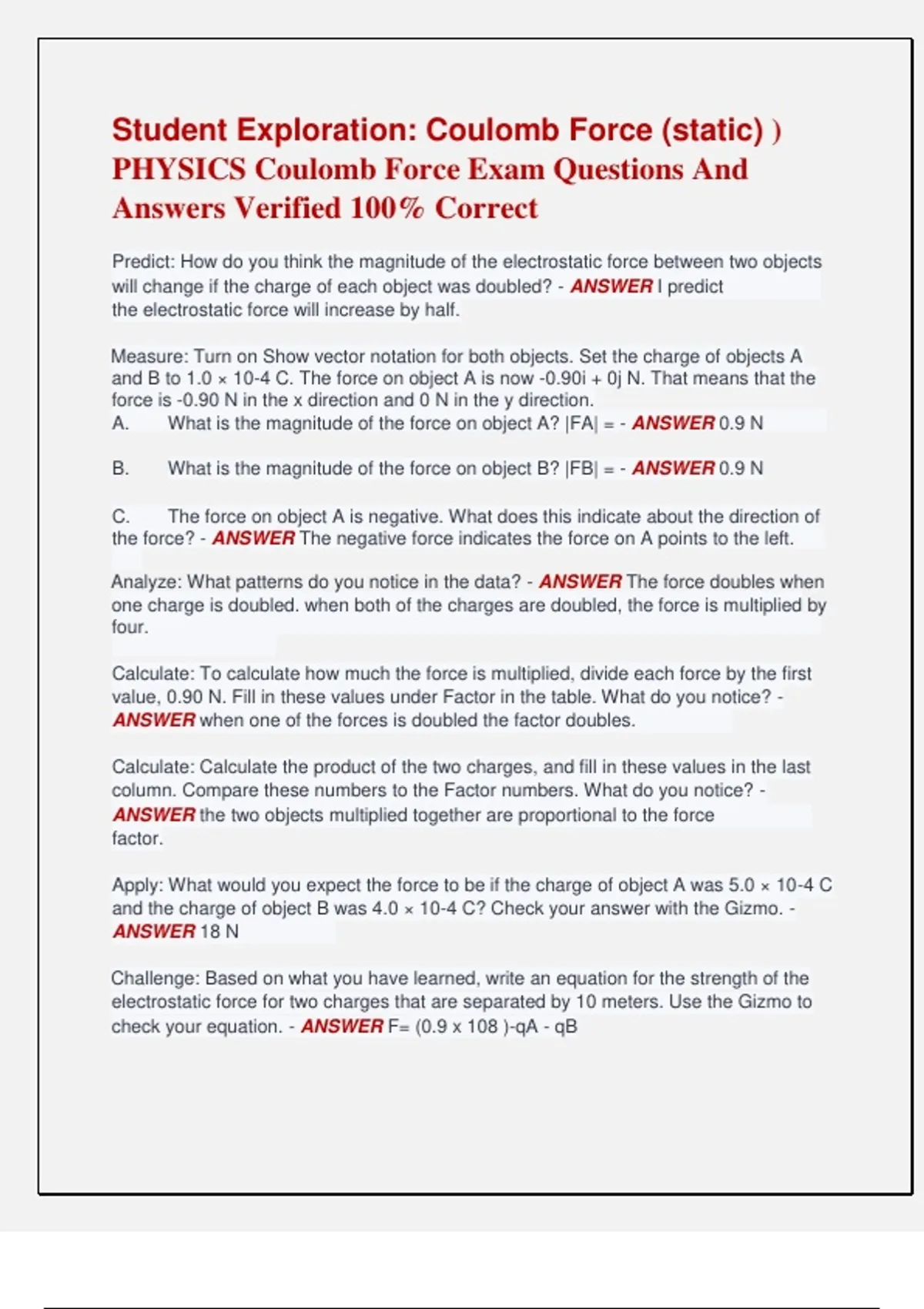 Student Exploration: Coulomb Force (static) ) PHYSICS Coulomb Force Exam Questions And Answers Verified 100% Correct Predict: How do you think the magnitude of the electrostatic force between two objects will change if the charge of each object was doubled? - ANSWER I predict the electrostatic force will increase by half. Measure: Turn on Show vector notation for both objects. Set the charge of objects A and B to 1.0 × 10-4 C. The force on object A is now -0.90i + 0j N. That means that the force is -0.90 N in the x direction and 0 N in the y direction. A. What is the magnitude of the force on object A? |FA| = - ANSWER 0.9 N B. What is the magnitude of the force on object B? |FB| = - ANSWER 0.9 N C. The force on object A is negative. What does this indicate about the direction of the force? - ANSWER The negative force indicates the force on A points to the left. Analyze: What patterns do you notice in the data? - ANSWER The force doubles when one charge is doubled. when both of the charges are doubled, the force is multiplied by four. Calculate: To calculate how much the force is multiplied, divide each force by the first value, 0.90 N. Fill in these values under Factor in the table. What do you notice? - ANSWER when one of the forces is doubled the factor doubles. Calculate: Calculate the product of the two charges, and fill in these values in the last column. Compare these numbers to the Factor numbers. What do you notice? - ANSWER the two objects multiplied together are proportional to the force factor. Apply: What would you expect the force to be if the charge of object A was 5.0 × 10-4 C and the charge of object B was 4.0 × 10-4 C? Check your answer with the Gizmo. - ANSWER 18 N Challenge: Based on what you have learned, write an equation for the strength of the electrostatic force for two charges that are separated by 10 meters. Use the Gizmo to check your equation. - ANSWER F= (0.9 x 108 )-qA - qB How do you think the sock and underwear became charged? - ANSWER While they were in the dryer some electrons were removed from some items and were transferred to other items. Suppose two socks acquire the same charge. Do you think they would stick together? Explain: - ANSWER They won't stick together because they both would have the same charge. Are the vectors for objects A and B pointing together or away from each other? - ANSWER away from each other Are objects A and B attracted together or repelled apart? - ANSWER they are repelled apart. Compare the lengths of the vectors. What do you notice? - ANSWER the length of both vectors are equal. Observe: You can change the charge of each object by entering the desired value in the qA and qB boxes. Observe the force vectors for each of the situations listed in the table below. Based on the force vectors, state whether the objects are repelled from one another, attracted to one another, or if there is no force at all. - ANSWER 1.0 × 10-4 C 1.0 × 10-4 C - ANSWER repulsion -1.0 × 10-4 C 1.0 × 10-4 C - ANSWER attraction -1.0 × 10-4 C -1.0 × 10-4 C - ANSWER repulsion 1.0 × 10-4 C 0.0 × 10-4 C - ANSWER no force When the charges are the same, the two objects _____________ one another. - ANSWER repel When the charges are opposite, the two objects _____________ one another. - ANSWER attract When one of the objects has no charge, the resulting force is - ANSWER