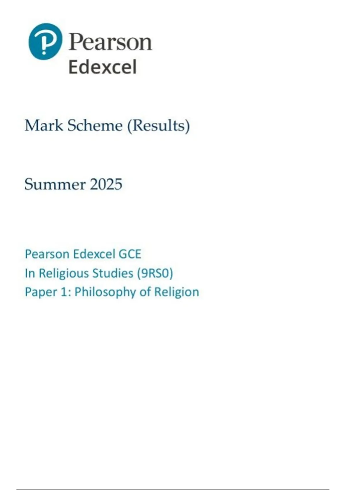 edexcel religious studies 9rs0 01 paper 1 philosophy of religion mark scheme june 2025edexcel
