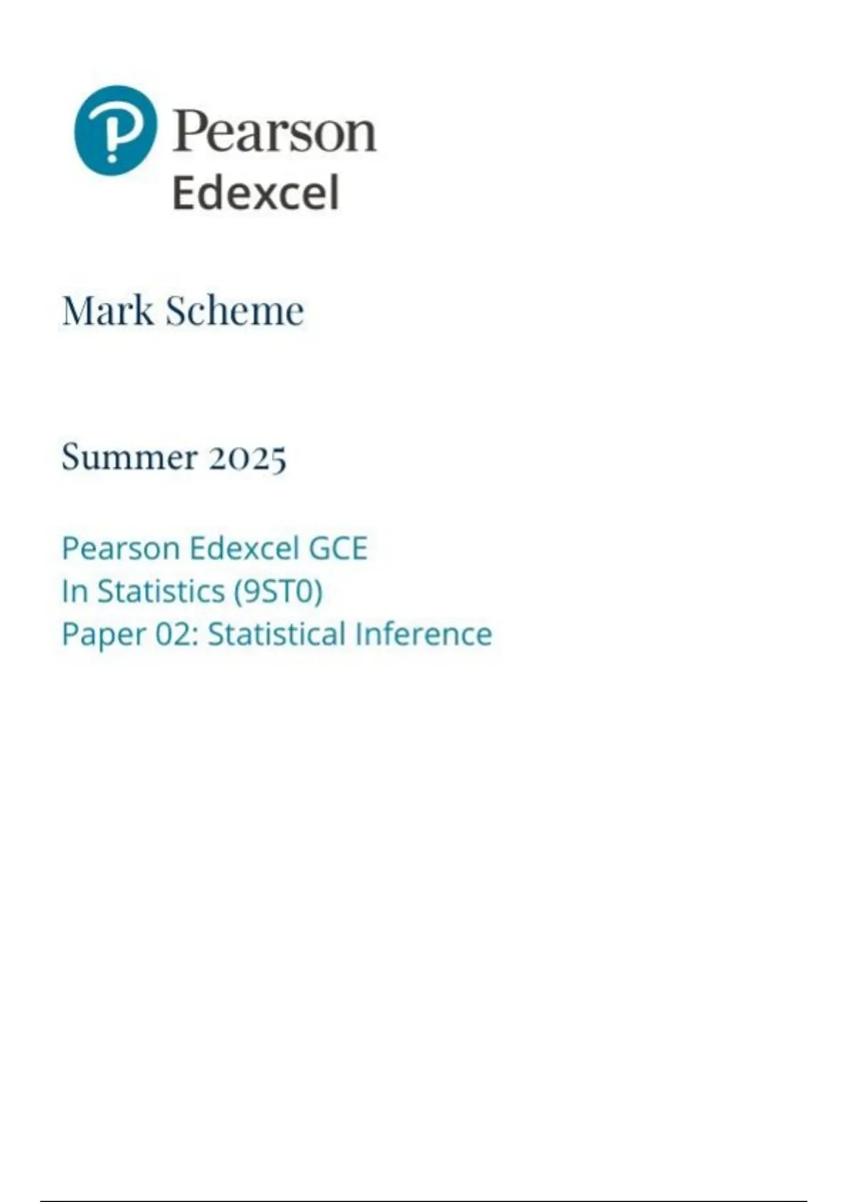 edexcel statistics 9st0 02 paper 2 statistical inference mark scheme june 2025edexcel