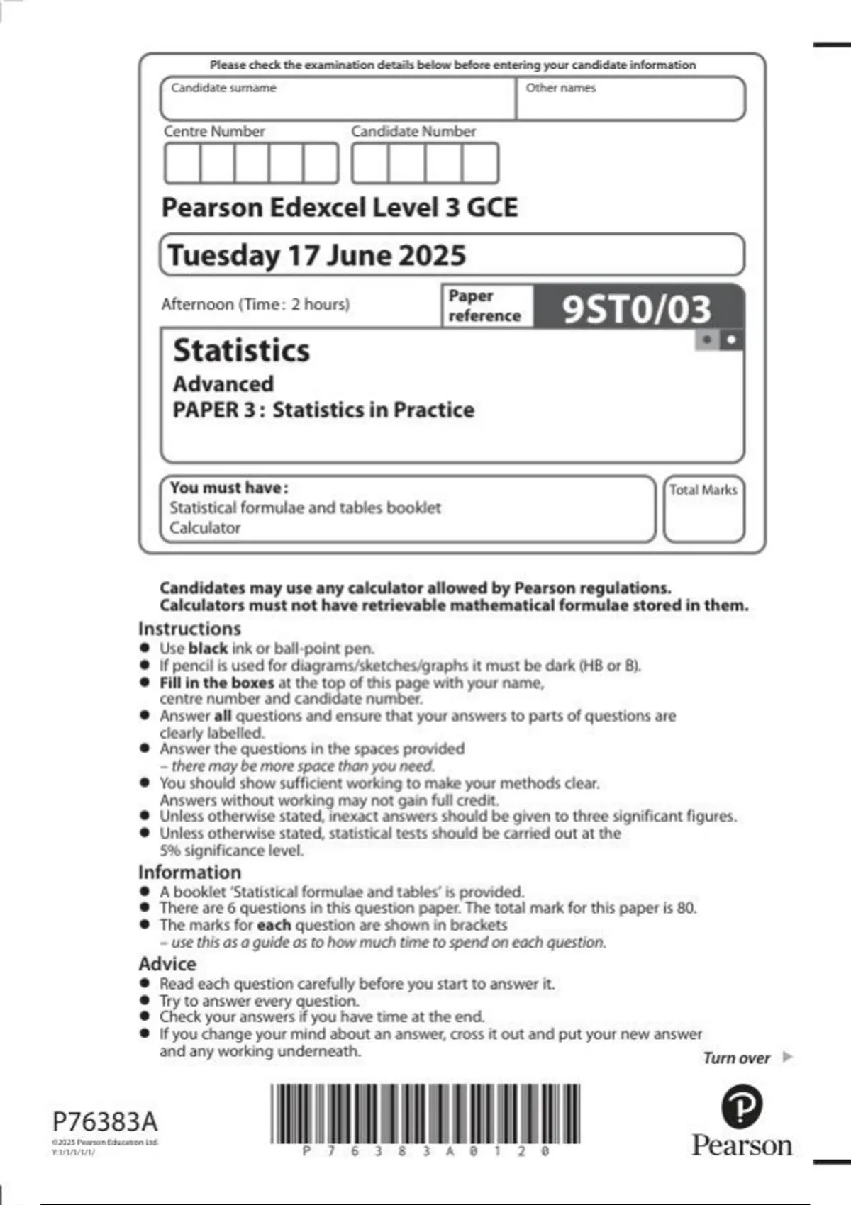 EDEXCEL statistics 9st0-03 paper 3- statistics in practice june-2025