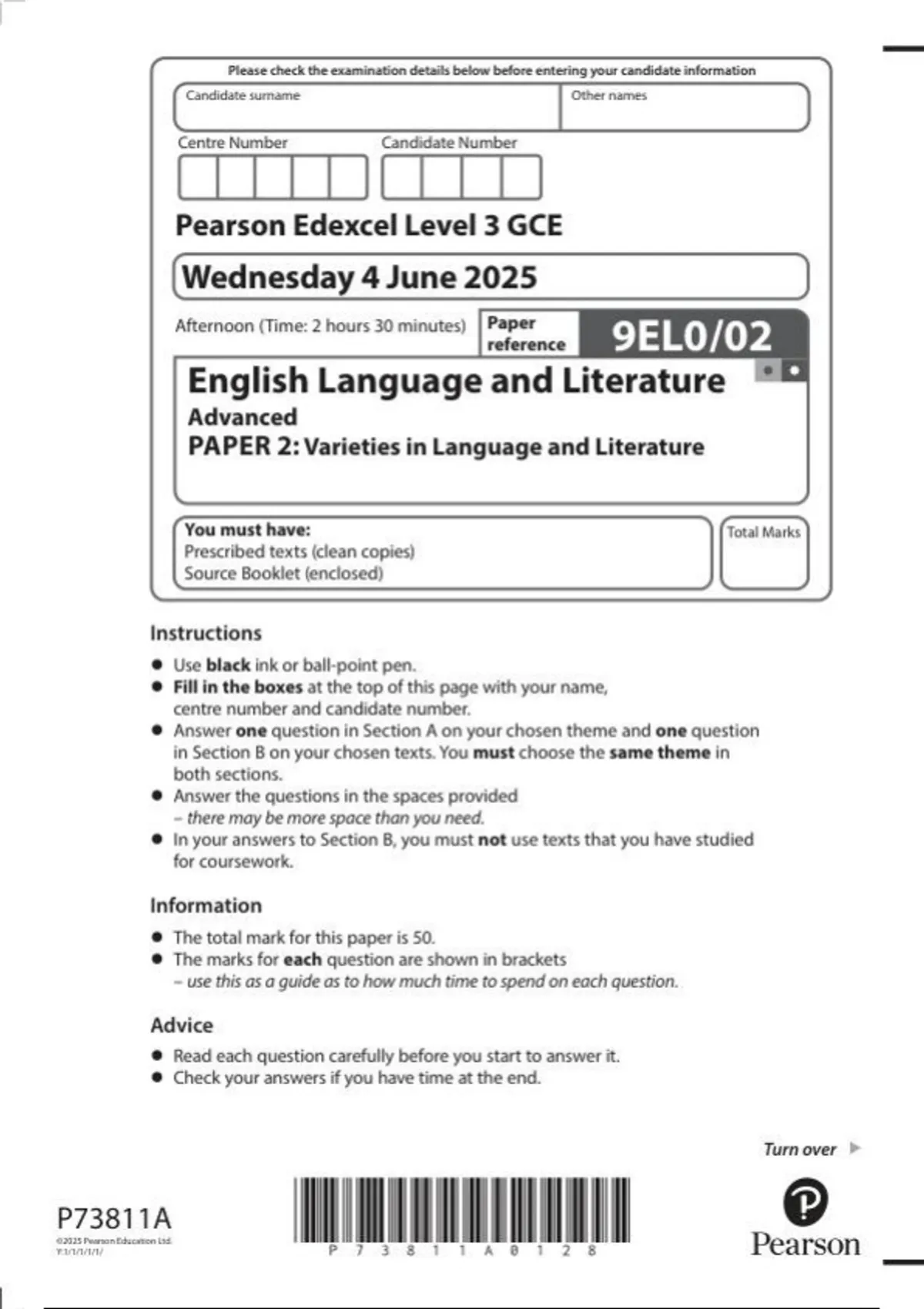 Pearson Edexcel GCE 9el0-02 in English Language and Literature (9EL0) Paper 2- Varieties in Language and Literature june 2025