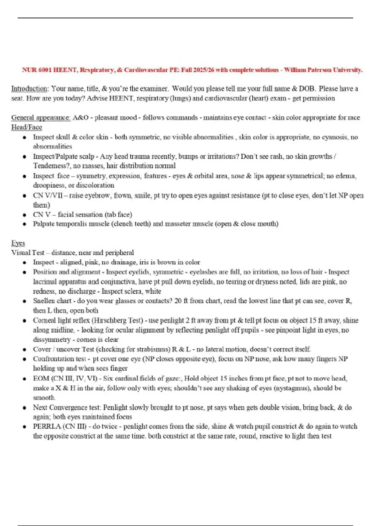 NUR 6001 HEENT, Respiratory, & Cardiovascular PE: Fall 2025/26 with complete solutions - William Paterson University.