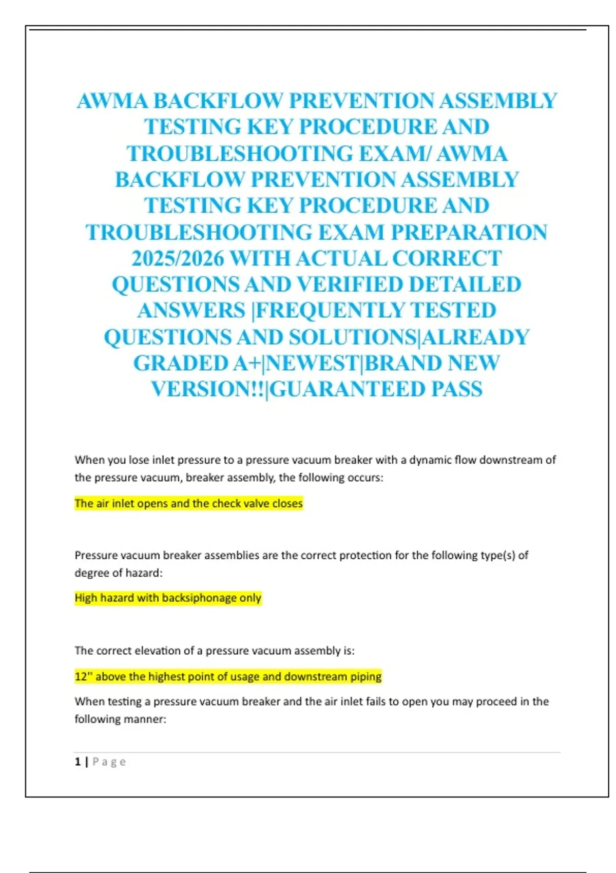 AWMA BACKFLOW PREVENTION ASSEMBLY TESTING KEY PROCEDURE AND TROUBLESHOOTING EXAM/ AWMA BACKFLOW PREVENTION ASSEMBLY TESTING KEY PROCEDURE AND TROUBLESHOOTING EXAM PREPARATION 2025/2026 WITH ACTUAL CORRECT QUESTIONS AND VERIFIED DETAILED ANSWERS |FREQUENTLY TESTED QUESTIONS AND SOLUTIONS|ALREADY GRADED A+|NEWEST|BRAND NEW VERSION!!|GUARANTEED PASS