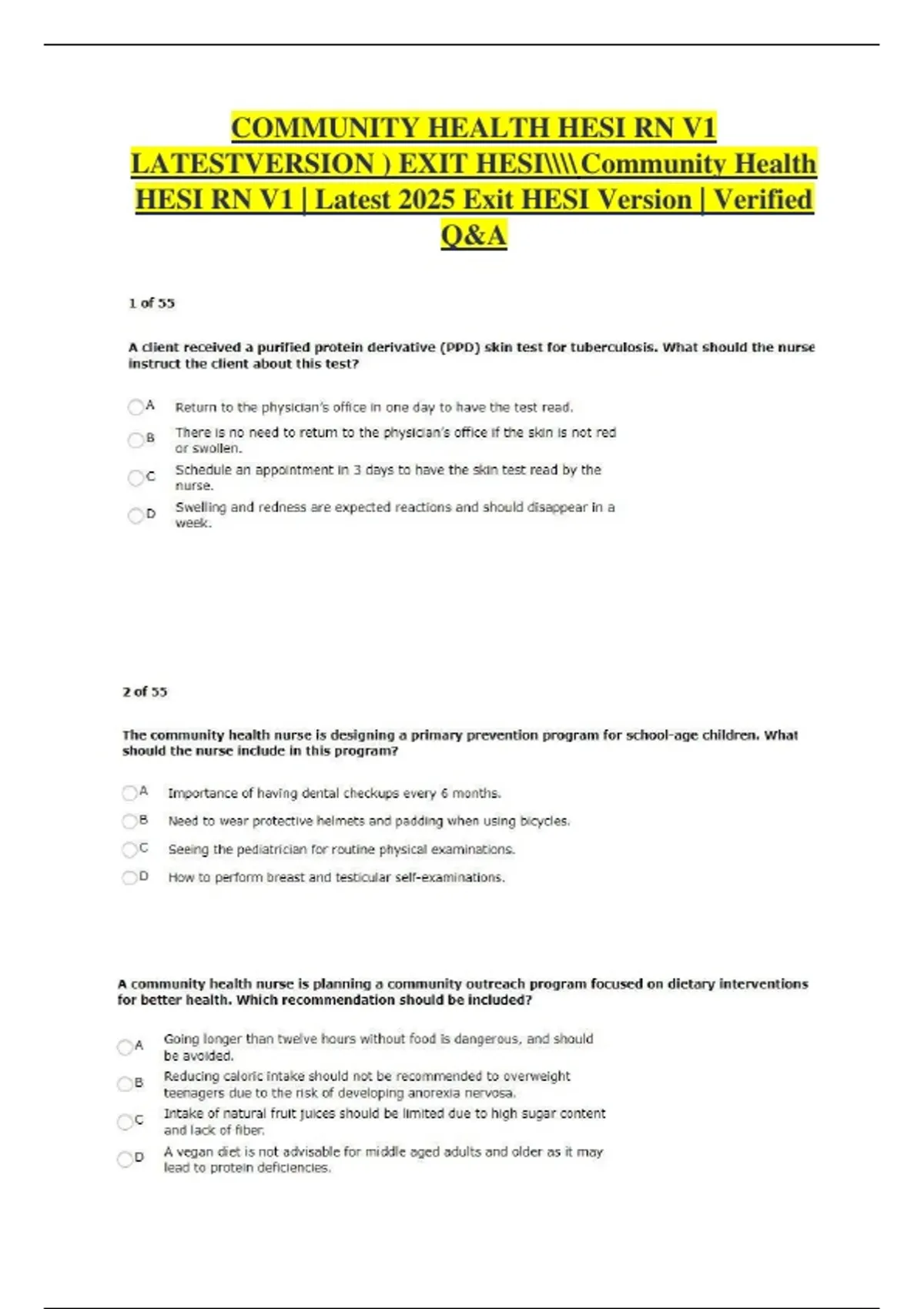 Get the latest 2025 Community Health HESI RN V1 Exit Exam with verified questions and correct answers. Covers public health nursing, epidemiology, health promotion, communicable diseases, and community-based care—perfect for HESI RN exam preparation.