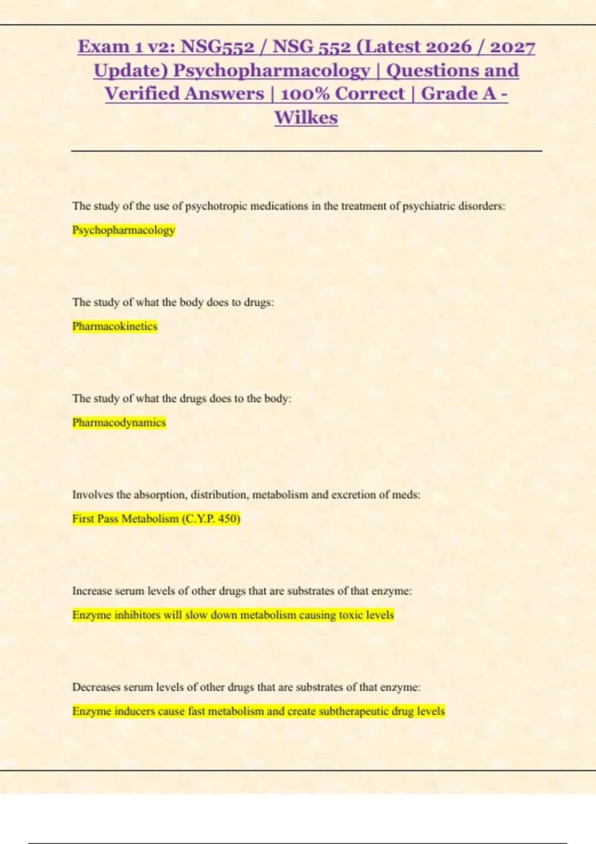 Exam 1 v2: NSG552 / NSG 552 (Latest 2026 / 2027 Update) Psychopharmacology | Questions and Verified Answers | 100% Correct | Grade A - Wilkes