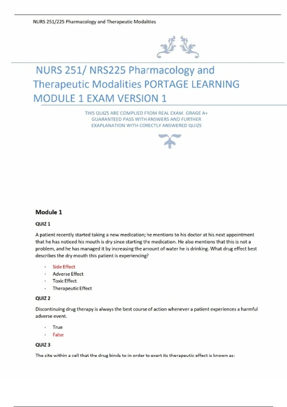 NURS 251 Nrs225 Pharmacology and Therapeutic Modalities Portage Learning Module 1 Exam Version 1questions and A