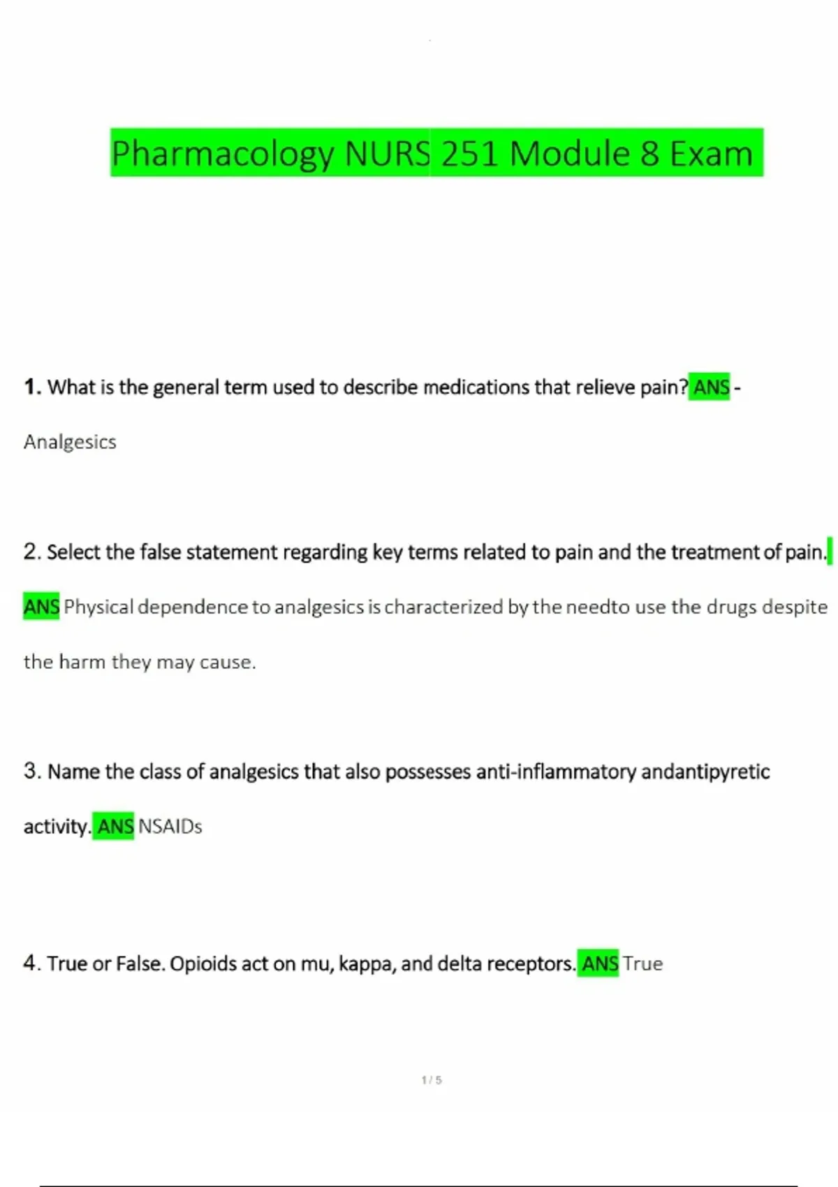 Pharmacology Nursing 251 Module Exam 8 Portage Learning Nursing Comprehensive Question and A