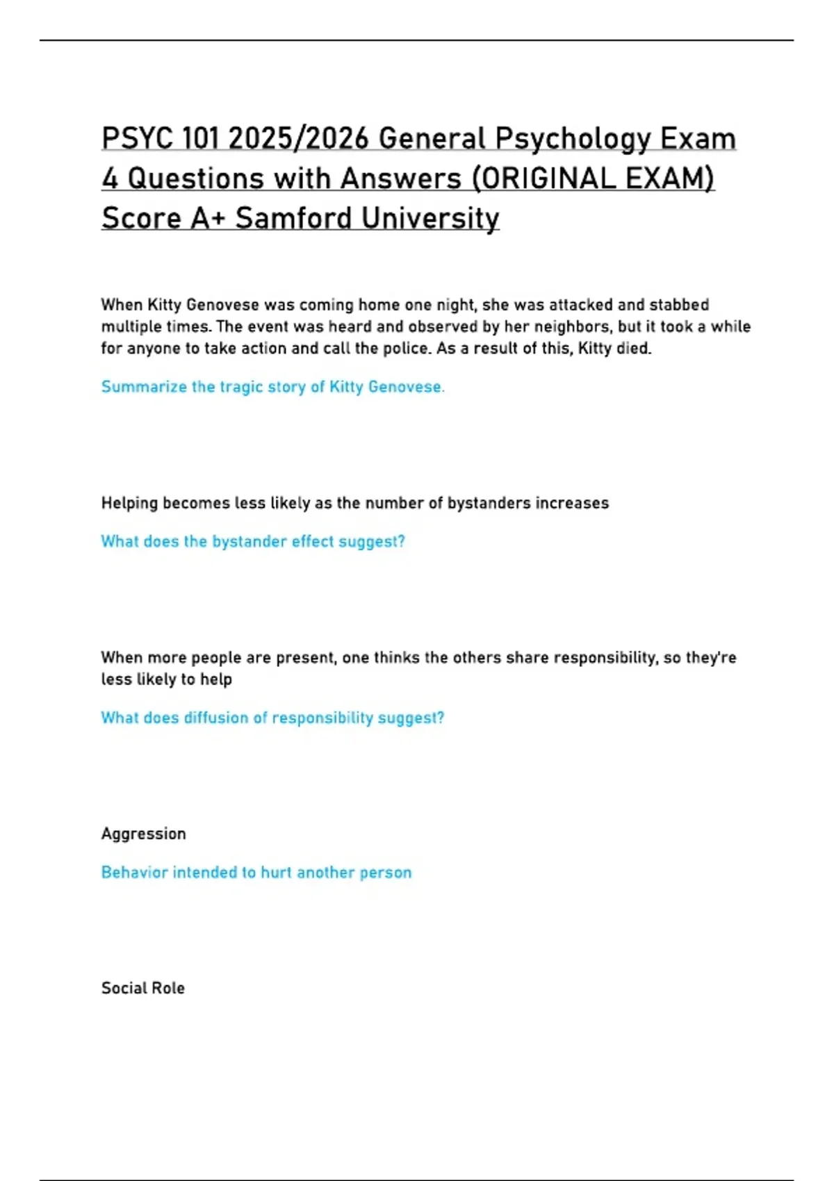 PSYC 101 2025/2026 General Psychology Exam 4 Questions with Answers (ORIGINAL EXAM) Score A+ Samford University When Kitty Genovese was coming home one night, she was attacked and stabbed multiple times. The event was heard and observed by her neighbors, but it took a while for anyone to take action and call the police. As a result of this, Kitty died. Summarize the tragic story of Kitty Genovese. Helping becomes less likely as the number of bystanders increases What does the bystander effect suggest? When more people are present, one thinks the others share responsibility, so they're less likely to help What does diffusion of responsibility suggest?