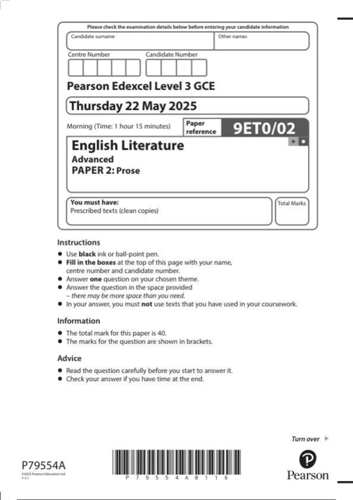 Pearson Edexcel a level English Literature| question paper |2025|9ET0/02|