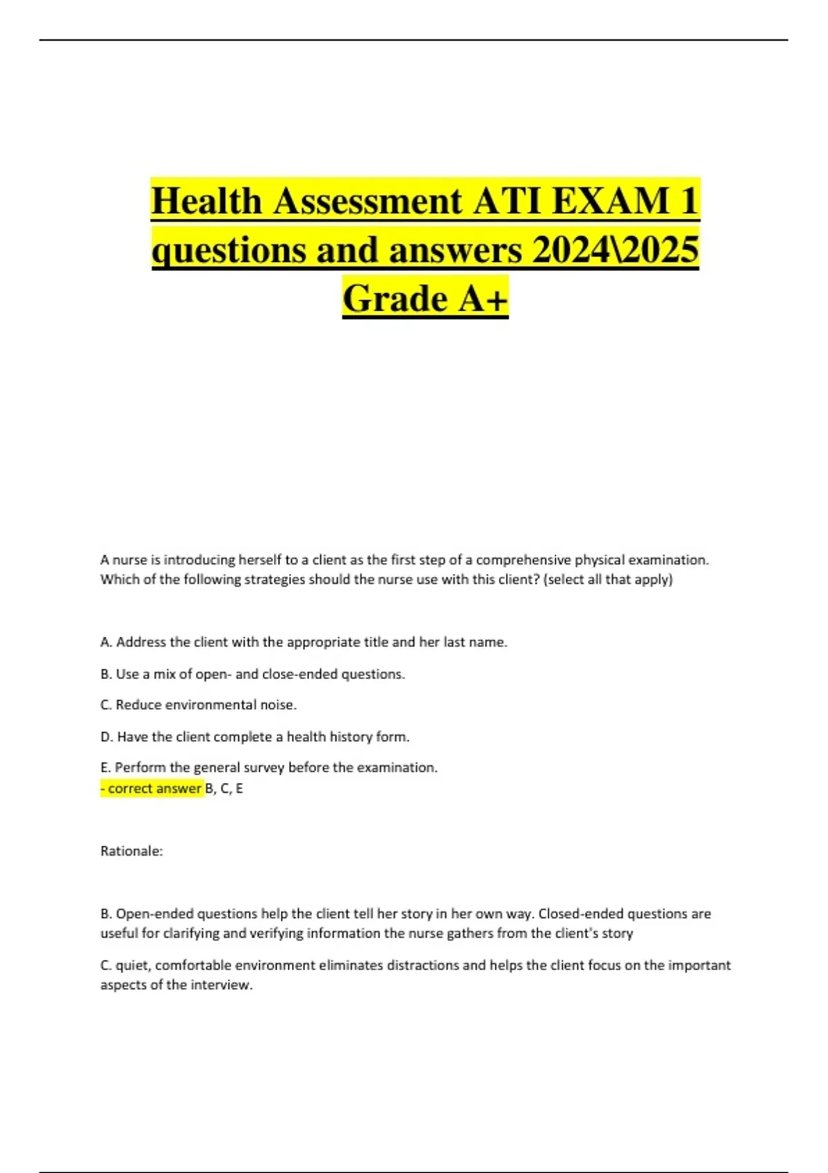This Health Assessment ATI Exam 1 Study Guide 2024/2025 (Grade A+) includes verified questions and correct answers covering essential concepts in nursing health assessment. Topics include physical assessment techniques, vital signs, pain management, health history, communication, cultural competence, and clinical examination methods. Fully updated for 2024/2025, this guide ensures thorough preparation for ATI Exam 1, helping nursing, BSN, and ADN students achieve A+ results. Perfect for those seeking mastery of assessment skills and nursing fundamentals required for success in clinical practice.