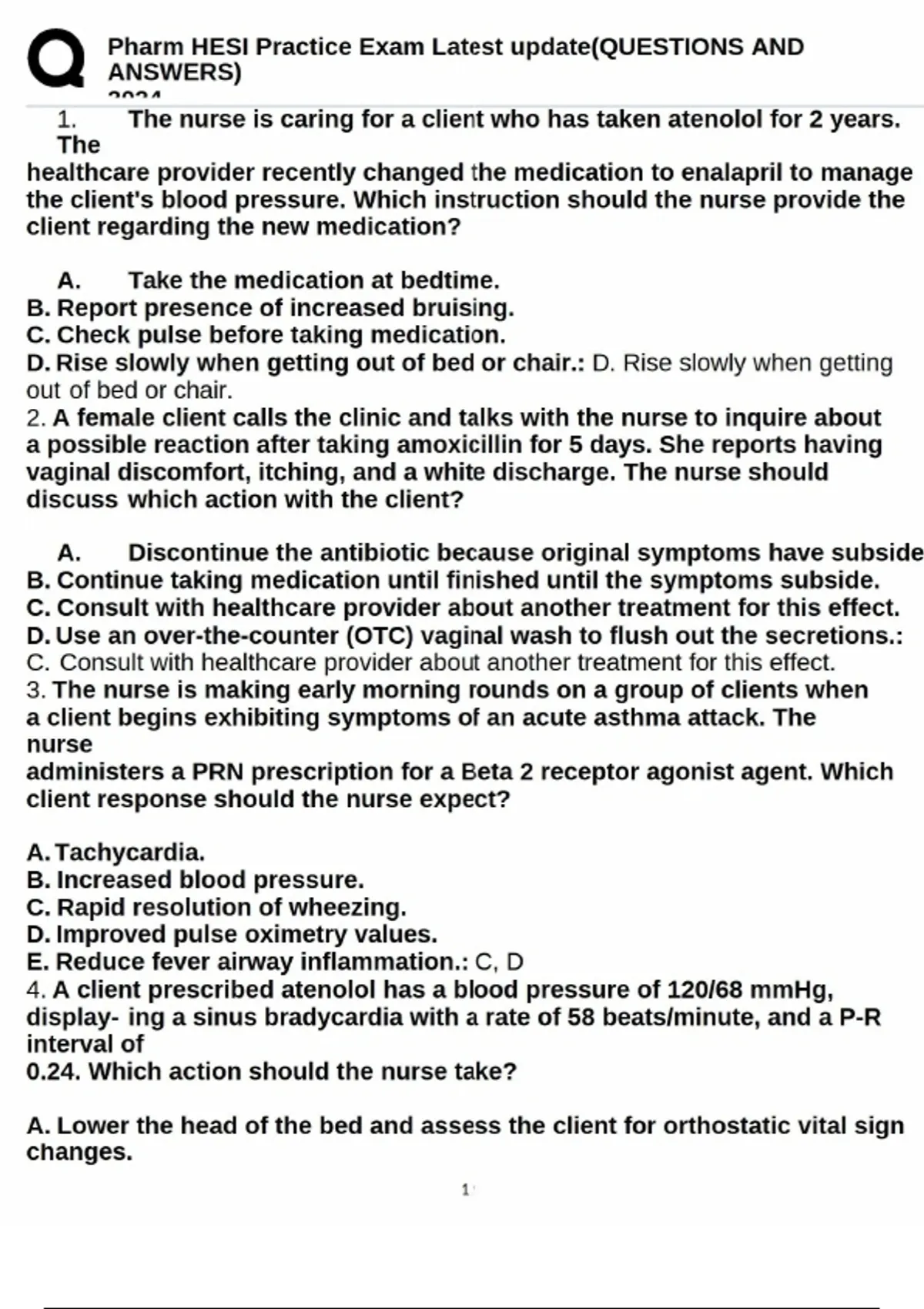 Pharm HESI Practice Exam Latest update(QUESTIONS AND ANSWERS) 2024 1 / 17 1. The nurse is caring for a client who has taken atenolol for 2 years. The healthcare provider recently changed the medication to enalapril to manage the client's blood pressure. Which instruction should the nurse provide the client regarding the new medication? A. Take the medication at bedtime. B. Report presence of increased bruising. C. Check pulse before taking medication. D. Rise slowly when getting out of bed or chair.: D. Rise slowly when getting out of bed or chair. 2. A female client calls the clinic and talks with the nurse to inquire about a possible reaction after taking amoxicillin for 5 days. She reports having vaginal discomfort, itching, and a white discharge. The nurse should discuss which action with the client? A. Discontinue the antibiotic because original symptoms have subsided. B. Continue taking medication until finished until the symptoms subside. C. Consult with healthcare provider about another treatment for this effect. D. Use an over-the-counter (OTC) vaginal wash to flush out the secretions.: C. Consult with healthcare provider about another treatment for this effect. 3. The nurse is making early morning rounds on a group of clients when a client begins exhibiting symptoms of an acute asthma attack. The nurse administers a PRN prescription for a Beta 2 receptor agonist agent. Which client response should the nurse expect? A. Tachycardia. B. Increased blood pressure. C. Rapid resolution of wheezing. D. Improved pulse oximetry values. E. Reduce fever airway inflammation.: C, D 4. A client prescribed atenolol has a blood pressure of 120/68 mmHg, display- ing a sinus bradycardia with a rate of 58 beats/minute, and a P-R interval of 0.24. Which action should the nurse take? A. Lower the head of the bed and assess the client for orthostatic vital sign changes.Pharm HESI Practice Exam Latest update(QUESTIONS AND ANSWERS) 2024 2 / 17 B. Give the medication as prescribed and continue to monitor the client. C. Prepare to administer atropine sulfate IV push.Pharm HESI Practice Exam Latest update(QUESTIONS AND ANSWERS) 2024 3 / 17 D. Hold the prescribed dose and contact the healthcare provider.: B. Give the medication as prescribed and continue to monitor the client. 5. The nurse is preparing the 0900 dose of losartan (Cozaar), an angiotensin II receptor blocker (ARB), for a client with hypertension and heart failure. The nurse reviews the client's laboratory results and notes that the client's serum potassium level is 5.9 mEq/L. Which action should the nurse take first? A. Withhold the scheduled dose. B. Check the client's apical pulse. C. Notify the healthcare provider. D. Repeat the serum potassium level.: A. Withhold the scheduled dose. 6. Upon admission to the emergency center, an adult client with acute status asthmaticus is prescribed this series of medications. In which order should the nurse administer the prescribed medications? (Arrange from first to last.)- : 1. Albuterol (Proventil) puffs. 2. Salmeterol (Serevent Diskus). 3. Prednisone (Deltasone) orally. 4. Gentamicin (Garamycin) IM. 7. An adult client is given a prescription for a scopolamine patch (Transderm Scop) to prevent motion sickness while on a cruise. Which information should the nurse provide to the client? A. Apply the patch at least 4 hours prior to departure. B. Change the patch every other day while on the cruise. C. Place the patch on a hairless area at the base of the skull. D. Drink no more than 2 alcoholic drinks during the cruise.: A. Apply the patch at least 4 hours prior to departure. 8. A client with giardiasis is taking metronidazole (Flagyl) 2 grams PO. Which information should the nurse include in the client's instruction? A. Notify the clinic of any changes in the color of urine. B. Avoid overexposure to the sun. C. Stop the medication after the diarrhea resolves. D.Take the medication with food.: D. Take the medication with food. 9. A female client with rheumatoid arthritis takes ibuprofen (Motrin) 600 mg PO 4 times a day. To prevent gastrointestinal bleeding, misoprostol (Cytotec) 100 mcg PO is prescribed. Which information is most importantPharm HESI Practice Exam Latest update(QUESTIONS AND ANSWERS) 2024 4 / 17 for the nurse to include in client teaching?Pharm HESI Practice Exam Latest update(QUESTIONS AND ANSWERS) 2024 5 / 17 A. Use contraception during intercourse. B. Ensure the Cytotec is taken on an empty stomach. C. Encourage oral fluid intake to prevent constipation. D.Take Cytotec 30 minutes prior to Motrin.: A. Use contraception during inter- course. 10. A client with osteoarthritis receives a new prescription for celecoxib (Cele- brex) orally for symptom management. The nurse notes the client is allergic to sulfa. Which action is most important for the nurse to implement prior to administering the first dose? A. Review the client's hemoglobin results. B. Notify the healthcare provider. C. Inquire about the reaction to sulfa. D. Record the client's vital signs.: B. Notify the healthcare provider. 11. A client is admitted to the hospital for a new onset of supraventricular tachycardia (SVT) and is prescribed digoxin. For which laboratory finding should the nurse notify the healthcare provider immediately? A. Potassium level of 3.1 mEq/L. B. Sodium level of 132 mEq/L. C. Calcium level of 8.6 mg/dL. D. Magnesium level of 1.2 mEq/L.: A. Potassium level of 3.1 mEq/L. 12. The nurse is transcribing a new prescription for spironolactone (Aldactone) for a client who receives an angiotensin-converting enzyme (ACE) inhibitor. Which action should the nurse implement? A. Verify both prescriptions with the healthcare provider. B. Report the medication interactions to the nurse manager. C. Hold the ACE inhibitor and give the new prescription. D.Transcribe and send the prescription to the pharmacy.: A. Verify both pre- scriptions with the healthcare provider. 13. The nurse admits a client with tumor-induced sp