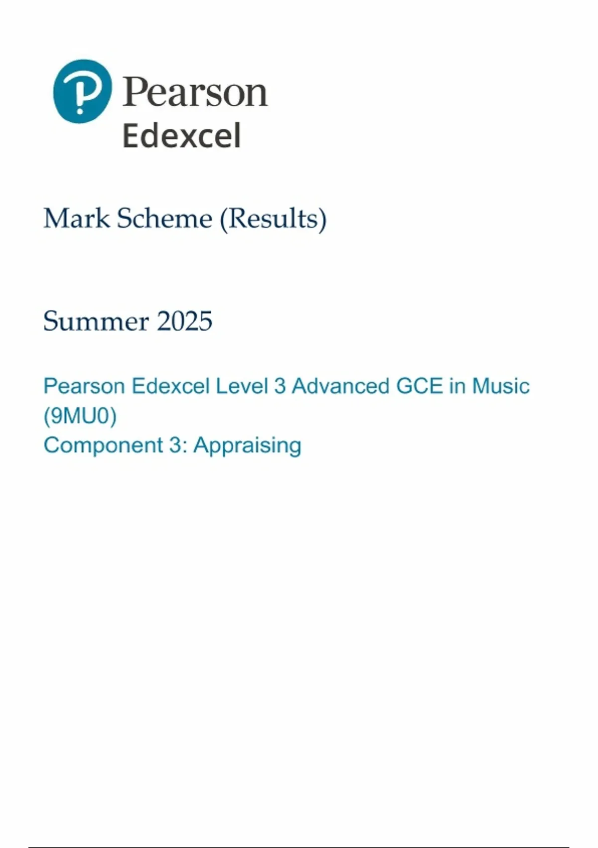 PEARSON EDEXCEL A LEVEL MUSIC PAPER 3 MARK SCHEME 2025 (9MU0/03: COMPONENT 3: Appraising)