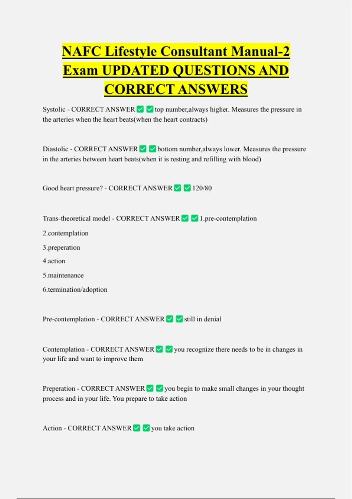 NAFC Lifestyle Consultant Manual-2 Exam UPDATED QUESTIONS AND CORRECT ANSWERS Systolic - CORRECT ANSWER top number,always higher. Measures the pressure in the arteries when the heart beats(when the heart contracts) Diastolic - CORRECT ANSWER bottom number,always lower. Measures the pressure in the arteries between heart beats(when it is resting and refilling with blood) Good heart pressure? - CORRECT ANSWER Trans-theoretical model - CORRECT ANSWER mplation ration n enance nation/adoption Pre-contemplation - CORRECT ANSWER Contemplation - CORRECT ANSWER 120/80 -contemplation still in denial you recognize there needs to be in changes in your life and want to improve them Preperation - CORRECT ANSWER you begin to make small changes in your thought process and in your life. You prepare to take action