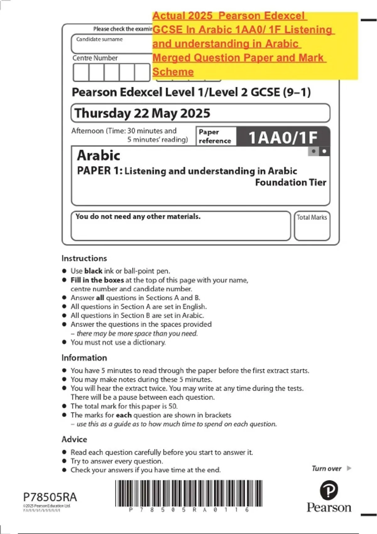 Actual 2025 Pearson Edexcel GCSE In Arabic 1AA0/ 1F Listening and understanding in Arabic Merged Question Paper and Mark Scheme