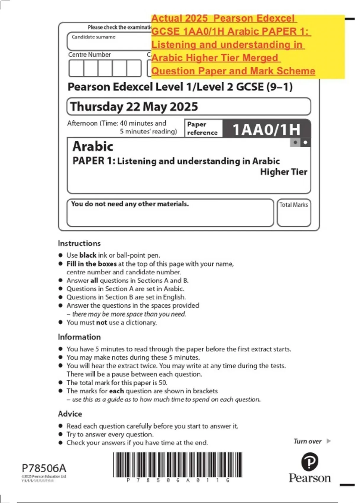 Actual 2025 Pearson Edexcel GCSE 1AA0/1H Arabic PAPER 1: Listening and understanding in Arabic Higher Tier Merged Question Paper and Mark Scheme
