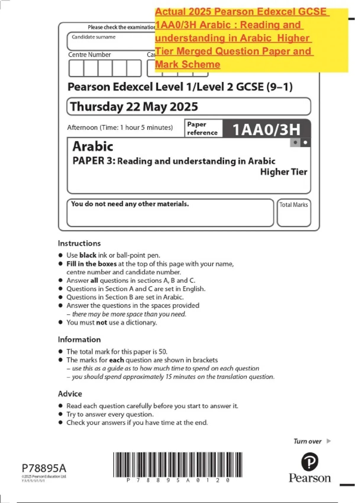 Actual 2025 Pearson Edexcel GCSE 1AA0/3H Arabic : Reading and understanding in Arabic Higher Tier Merged Question Paper and Mark Scheme