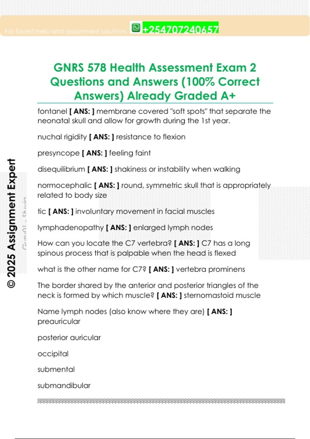 GNRS 578 Health Assessment Exam 2 Questions and Answers (100% Correct Answers) Already Graded A+