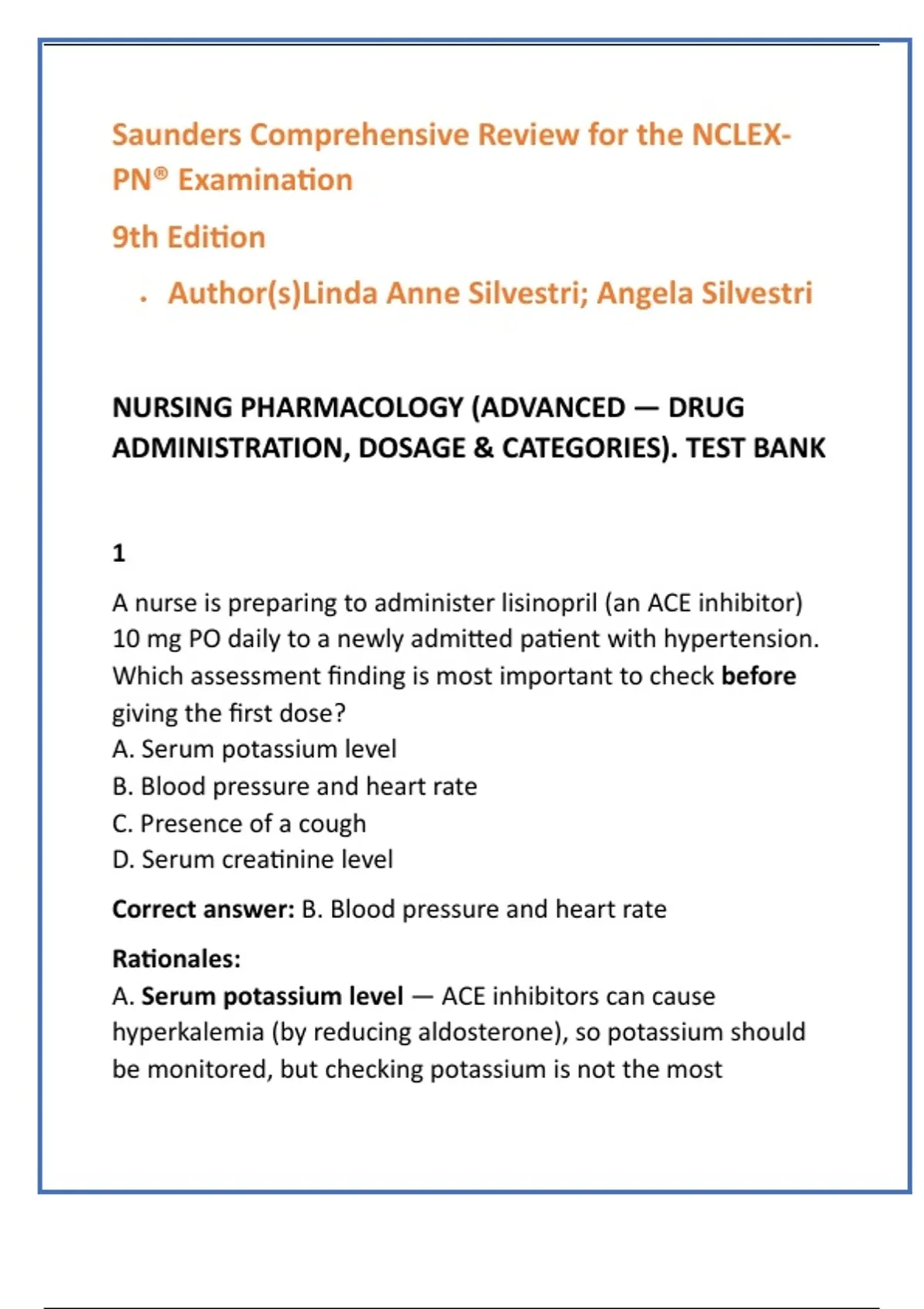 Saunders NCLEX-RN Pharmacology Test Bank 2025 | Drug Administration, Dosage Calculations & Safe Meds with Rationales Meta Description (150–180 characters) Master NCLEX pharmacology with 2025-aligned test bank questions covering safe drug administration, IV dosage, and major drug classes with rationales. Long-Form Product Description (400–600 words) Saunders NCLEX-RN Pharmacology Test Bank (Latest Edition) Achieve exam success and clinical confidence with this advanced pharmacology NCLEX-RN test bank, meticulously designed to align with the 2025 NCLEX-RN Test Plan and the trusted Saunders Comprehensive Review for the NCLEX-RN Examination (latest edition). This resource provides realistic NCLEX-style and NGN (Next Generation NCLEX) questions focusing on drug administration, dosage calculations, and major pharmacologic categories. Each item is written by expert nurse educators and NCLEX item writers to reflect the depth, style, and complexity of the actual NCLEX-RN exam. What’s Inside Safe Medication Administration: Apply the “Rights of Medication”, prevent errors, interpret patient data, and reinforce safety through real-world clinical scenarios. Dosage Calculations Mastery: Strengthen math confidence with IV infusion rate problems, pediatric mg/kg formulas, titration questions, and drug reconstitution tasks — all with step-by-step rationales. Pharmacologic Classifications: Deepen understanding of key systems: Cardiovascular agents: ACE inhibitors, beta-blockers, and diuretics. Psychiatric medications: SSRIs, antipsychotics, mood stabilizers, and anxiolytics. Nursing Priorities & Patient Teaching: Develop safe, evidence-based interventions and reinforce lab interpretation and therapeutic monitoring. Why Nursing Students & Educators Love This Test Bank Authentic NCLEX Format: All questions mirror current NGN standards—including case-based scenarios, cue recognition, and prioritization tasks. Comprehensive Rationales: Each answer option is explained in detail to reinforce clinical reasoning and pharmacologic safety principles. Educator-Ready Format: Ideal for classroom quizzes, simulation prep, or skill validation. Perfect for Self-Study: Build confidence and reduce anxiety with structured, test-like practice grounded in Saunders’ trusted framework. Updated for 2025 Standards: Fully aligned with the latest NCLEX-RN test plan and pharmacology competencies. Learning Outcomes After completing this test bank, learners will be able to: Administer medications safely using the ten rights of medication administration. Calculate and verify IV and pediatric dosages accurately. Identify therapeutic effects, contraindications, and side effects of major drug classes. Apply clinical judgment in managing medication-related nursing care. Educate patients effectively on drug adherence and lifestyle considerations. Perfect For Nursing Students preparing for NCLEX-RN or pharmacology exams. Nurse Educators seeking professional, ready-to-use classroom content. NCLEX Review Centers and online tutors needing reliable, evidence-based assessment material. Take Control of Your NCLEX Success Don’t rely on generic question banks. Practice with original, expertly written NCLEX pharmacology questions that sharpen critical thinking and ensure medication safety mastery. Download now and start building the pharmacologic confidence you need to pass the NCLEX-RN — the first time. Top 20 SEO Keywords NCLEX pharmacology questions Saunders NCLEX-RN review NCLEX-RN 2025 test bank Nursing pharmacology test bank NCLEX dosage calculation practice Safe medication administration NCLEX Drug classification NCLEX review Cardiovascular drugs NCLEX Psychiatric medications NCLEX questions IV infusion rate NCLEX practice Pediatric dosage calculation NCLEX NCLEX pharmacology rationales Next Generation NCLEX pharmacology Nursing educator test bank Nursing pharmacology study guide Medication error prevention NCLEX NCLEX test prep for nurses Pharmacology NCLEX review questions Nursing students NCLEX practice NCLEX-RN exam preparation 2025 Hashtags (15–20) #NCLEXPrep #PharmacologyReview #SaundersNCLEX #NursingStudents #RNExamSuccess #NCLEXTestBank #NursingEducation #DosageCalculations #SafeMedicationAdministration #NextGenNCLEX #NCLEXRN2025 #NurseLife #FutureNurse #MedMath #NursingRationales #ClinicalJudgment #NursingPharmacology #NurseEducatorTools #StudyNursing #NCLEXPractice Meta Tags (10–15) Title Tag: Saunders NCLEX-RN Pharmacology Test Bank 2025 | Drug Administration, Dosage & Rationales Description Tag: NCLEX pharmacology test bank covering safe drug administration, dosage calculations, and major drug classes with full rationales. Keyword Tags: NCLEX pharmacology, NCLEX RN review, dosage calculation, drug administration, safe medication practice, nursing pharmacology, Saunders review, nursing educator, test bank, rationales Author Tag: Expert Nurse Educator & NCLEX Item Writer Publisher Tag: Advanced Nursing Learning Resources Language Tag: English Copyright Tag: © 2025 Saunders-Based NCLEX Review Content Education Level Tag: Nursing Students / RN Candidates Format Tag: Digital Test Bank (PDF / Online) Subject Tag: Pharmacology / Nursing Education Test Plan Tag: NCLEX-RN 2025