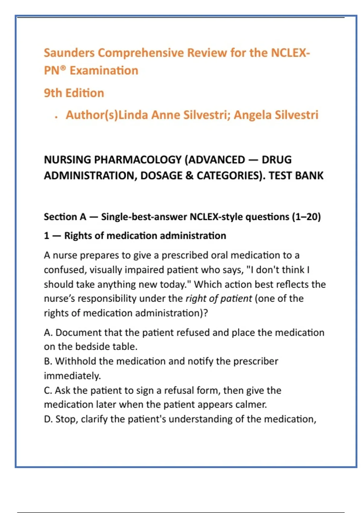 • D — Correct. The nurse must ensure the patient