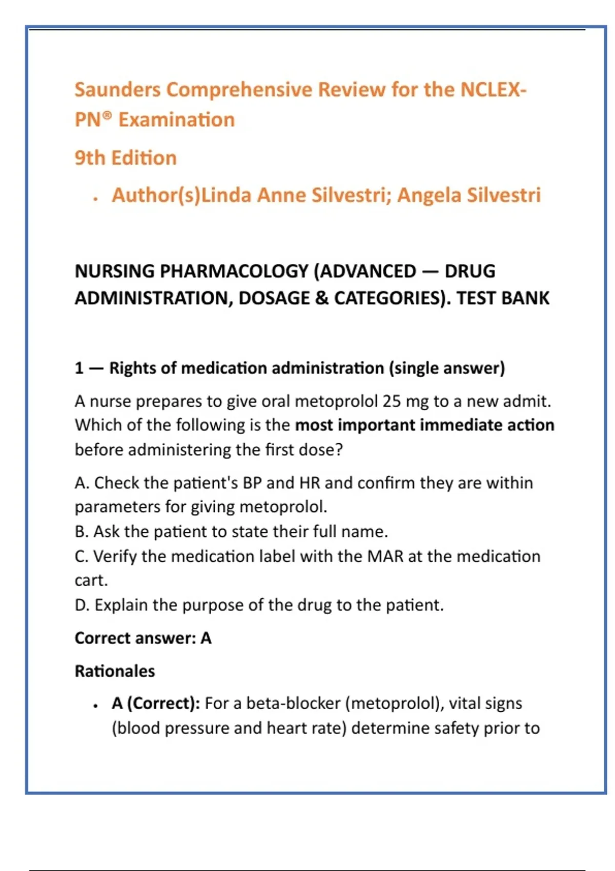 • A (Correct): For a beta-blocker (metoprolol), vital signs