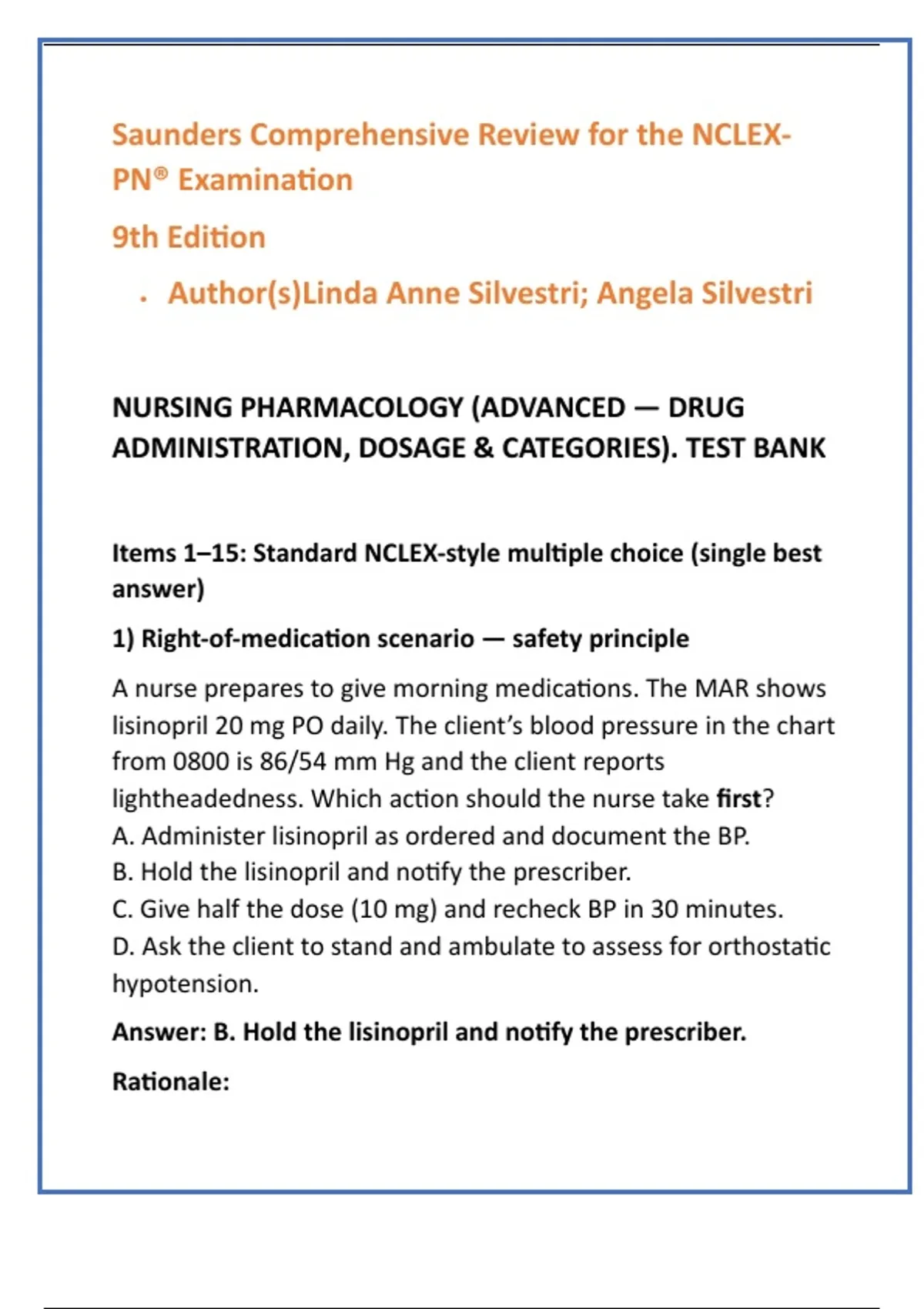 ADMINISTRATION, DOSAGE & CATEGORIES). TEST BANK