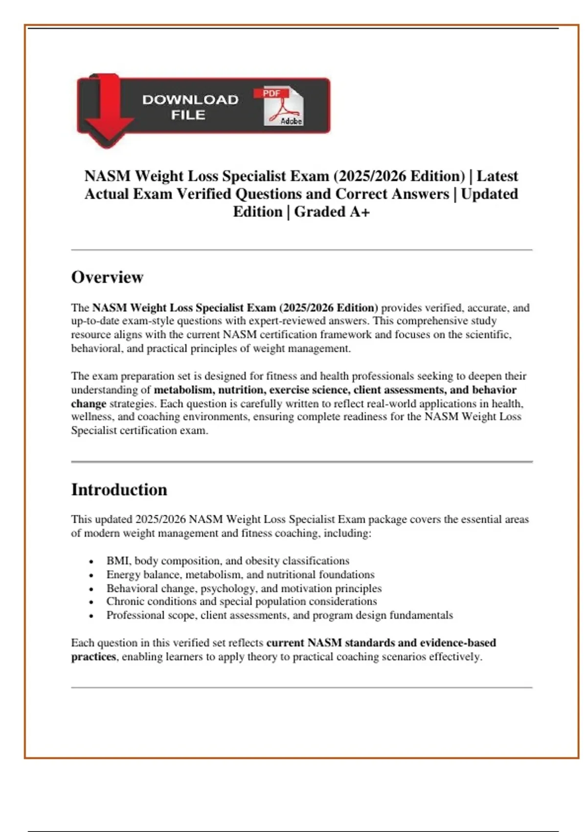 This updated 2025/2026 NASM Weight Loss Specialist Exam package covers the essential areas