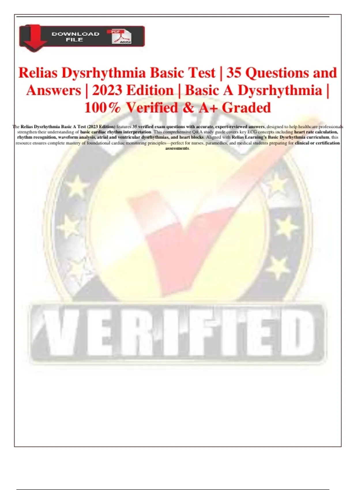 The Relias Dysrhythmia Basic A Test (2023 Edition) features 35 verified exam questions with accurate, expert-reviewed answers, designed to help healthcare professionals