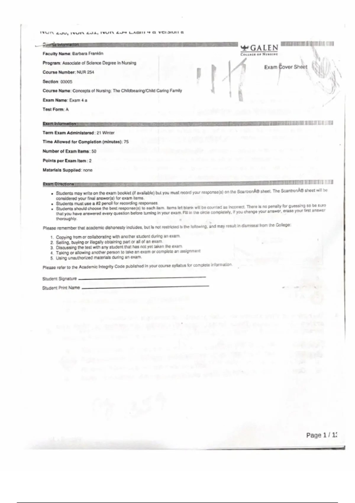 INUN 20U, IVUIN 204, INUN 24U LA+ a vociowia % GALEN T i Faculty Name: Barbara Franklin Co 2 or NURSING Program: Assoclate of Science Degree in Nursing = ] b : | Exam Cover Sheet Course Number: NUR 254 Section: 03005 Course Name: Concepts of Nursing: The Childbearing/Child Caring Family Exam Name: Exam 4 a Test Form: A T EERAEET e VELT Term Exam Administered: 21 Winter Time Allowed for Completion (minutes): 75 Number of Exam Items: 50 Points per Exam Item: 2 Materials Supplied: none BETEENNInO TN « Students may write on the exam booklet (if available) but you must record your response(s) on the ScantronA® sheet. The ScantronA® sheet will be considered your final answer(s) for exam items. « Students must use a #2 pencil for recording responses + Students should choose the best response(s) to each item. ltems left blank will be counted a that you have answered every question before tumning in your exam. Fill in the circie completely, thoroughly. s Incorrect. There Is no penalty for guessing so be sure It you change your answer, erase your first answer Please remember that academic dishonesty includes, but is not restricted to the following, and may result in dismissal from the College: . Copying from or collaborating with another student during an exam. . Selling, buying or illegally obtaining part or all of an exam. . Discussing the test with any student that has not yet taken the exam. . Taking or allowing another person to take an exam or complete an assignment . Using unauthorized materials during an exam. B wWN - Please refer to the Academic Integrity Code published in your course syllabus for complete information Student Signature Student Print Name = Page 1/ 1%N . disorderv(ADHD)~at~arschoo|.w‘ s shguld = a. Completes projects quickly. b. Prefers detailed tasks. === c. Refrains from volunteering. ( .} Grabs items from others without thinking. ud 2. The nurse is caring for an infant who is having an active seizure. Which of the following actions should the nurse perform when caring for the infant during a seizure? a. Place the infant in the prone position inside the crib. b. Suction any secretions out of the infant's mouth. can, Swaddle the infant to keep them warm and safe. : d” Remove any items out of the crib that can harm the infant.. 3. The nurse is screening infants for signs of cerebral palsy. Which findings from the box below should the nurse recognize as early signs of cerebral palsy? 1. Poorhead control/lag after fi & ’ @ n 1 month. 2. Feeding difficulties. «8uFailuretosmileby 2 months= 4. Persistent Moro reflex 5. Rigid arms or legs: A 296 b. . 3,4,5. ?:, ] v1|’12:,|5.0 1% 2,4,5. ¥ {d 4. The nurse is admitting a toddler who is being hospitalized following a near-drowning accident/submersion injury. The toddler is spontaneously breathing but is unconscious. Which of the following actions should the nurse perform first? '( 3) Administer oxygen via face mask. //- ‘b7 Implement seizure precautions. L c. Notify spiritual advisor of parents’ choice. d. Obtain arterial blood gases (ABGs). Page 2/13 OV INUN £04, INUN 20 LAl 4 a velaiun a Thq nurse is asses§ing a 6-year-old child for manifestations of autism spectrum disorder (ASD). Which of the following manifestations should the nurse expect to observe in this child? a. Continuous eye contact. ’ oq 3 b. Increased imitation of others, F . Interest in various activities. 0 ‘Verbal development delay: 6. Thenurseis caring for a child who has increased intracranial pressure (ICP) and is in stable cg_rlig’i?tion. Which of the following interventions should the nurse implement to decrease ICP in the chi a. Increase the number of visitors inside the child's room. Administer hypotonic intravenous (1V) fluids. Keep the child positioned midline on the bed. d. Administer opioids for pain control. 7. Thenurseis caring for a child who had a ventricular shunt placement 24 hours ago. The child is sitting up in bed crying and has vomited a small amount on the bed linens. Whick, of the following actions should the nurse take first? ‘a Perform a neurologic assessment. b. Obtain a complete metabolic panel (CMP) specimar c. Comfort the child while the linens are changes. d. Inspect the incision site for infection. 8. The nurse is caring for a child who is hospitalized for 24-hour observation follewing a head injury. Which of the following actions by the nurse is the priority? a. Assess for neck stiffness. b. Lower the television sound. @ Checking pupil reaction every 4 hours. d. Restrict visitation to 1 person at a time. ) . 9. Thenurse is assessing a child who is in a coma and notes decorticate posturing. Which of the following findings should the nurse expect the child to demonstrate? a. Rigid extension with head arched back, arms extended by the sides, and legs extended. Rigid flexion with elbows, wrists and fingers flexed, and legs extended and rotated/inward. 7 Abnormal flexion of upper and lower extremities. d. Abnormal extension of the upper extremities and flexion of lower extremities. 0 135" Paae 3/1: =— 10. 1. 12. 13. The nurse wurse is is caring cari for a child i who is i §uspected ofha f having lumbar still pending, Whigh of the following ac == - pio-Adminlstermorphinessilfate: LRI E | ; @) Assessing neurological status every 2 to 4 hours. »z d. The nurse is caring for a child who has Reye's syndrome. Which of the following should the nurse bacterialmeningiis, meningitis. The The rosuls resul of he fions the priority? et - v ~ Dectease noxiousolfactory stimuli: Maintain a lighted environment. include in the child's plan of care? a. 9 The nurse preceptor is discussing Down's syndrome with a newly hired nurse. Which of the following v Change the child’s body position every 2 hours. Assess the child for diplopia in both eyes. Administer salicylates for increased temperature every 4 hours as needed (PRN). Provide the child a quiet atmosphere with dimmed lighting: clinical manifestations identified by the new