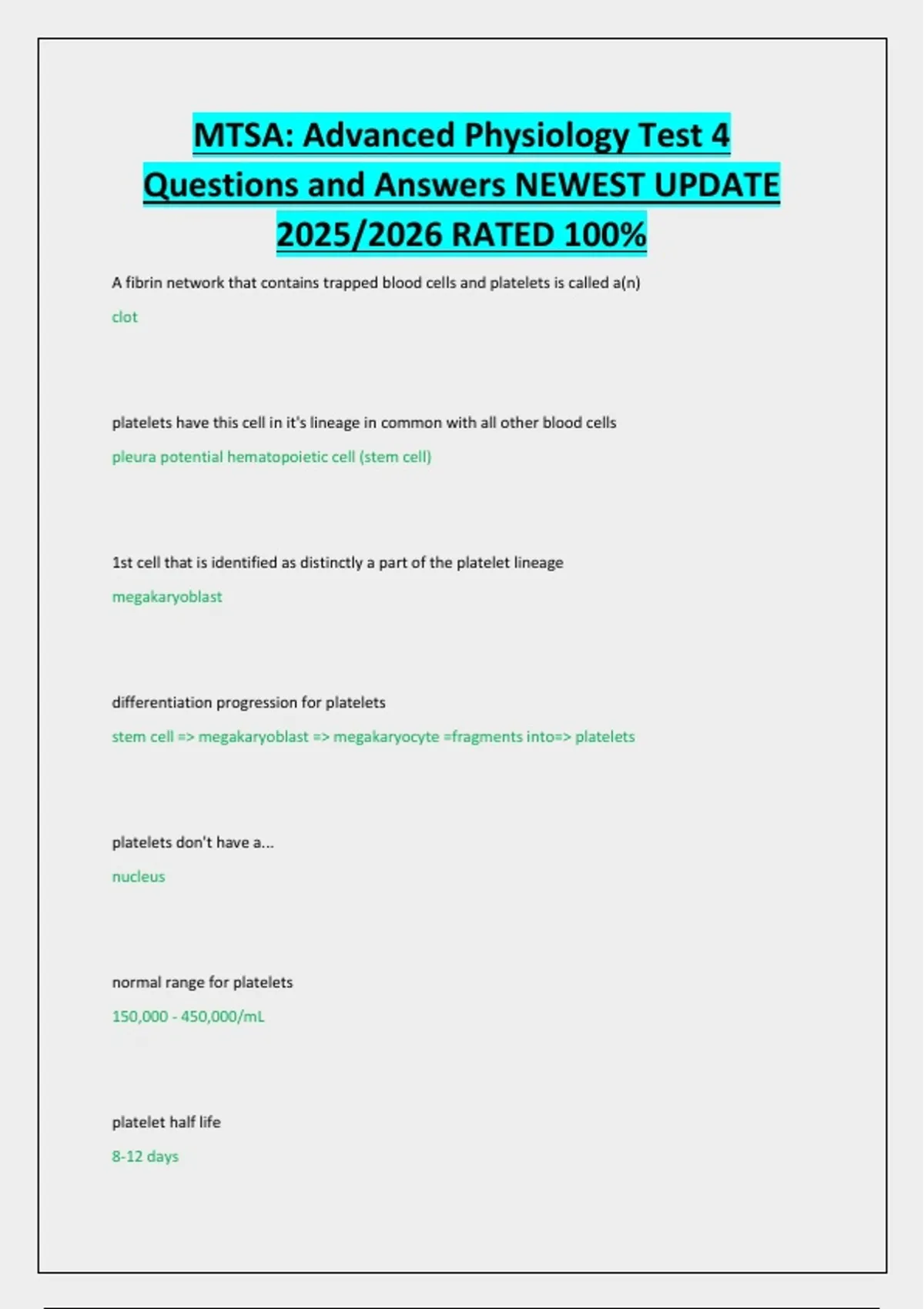 MTSA Advanced Physiology Test 4 Questions and Answers NEWEST UPDATE RATED 100%