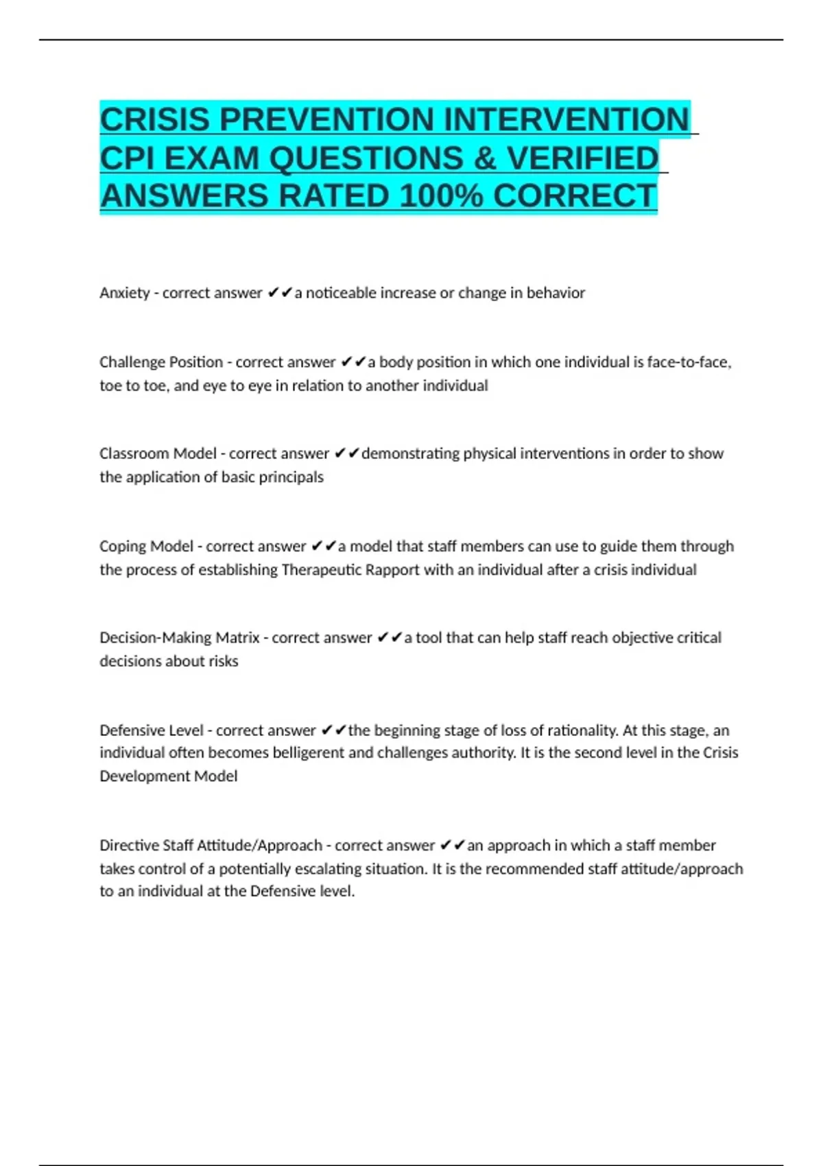 CRISIS PREVENTION INTERVENTION CPI EXAM QUESTIONS & VERIFIED ANSWERS RATED 100% CORRECT It contains flashcards, practice questions, and summaries that review the core principles, intervention techniques, and safety strategies taught in CPI training.