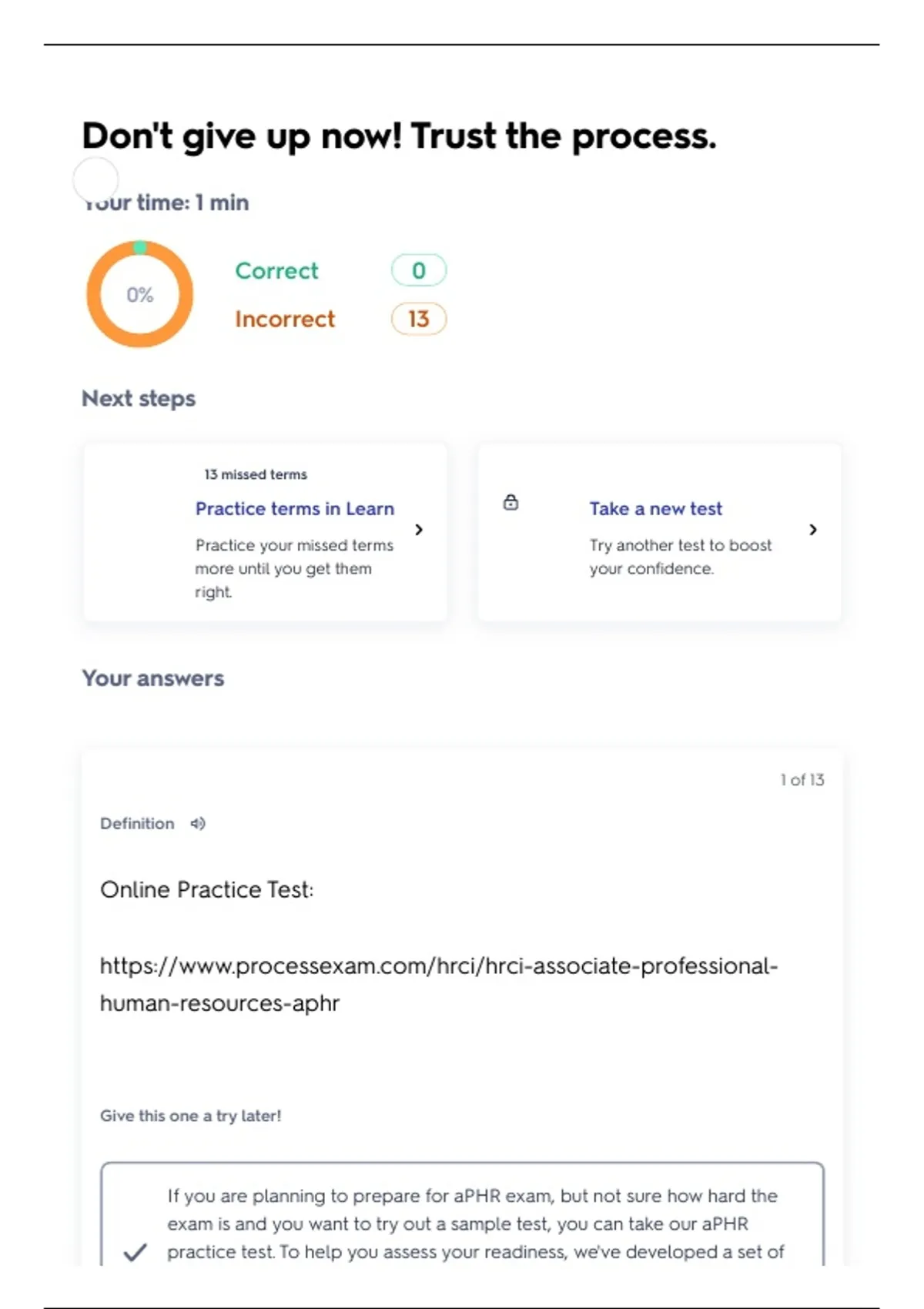 Practice your missed terms Try another test to boost