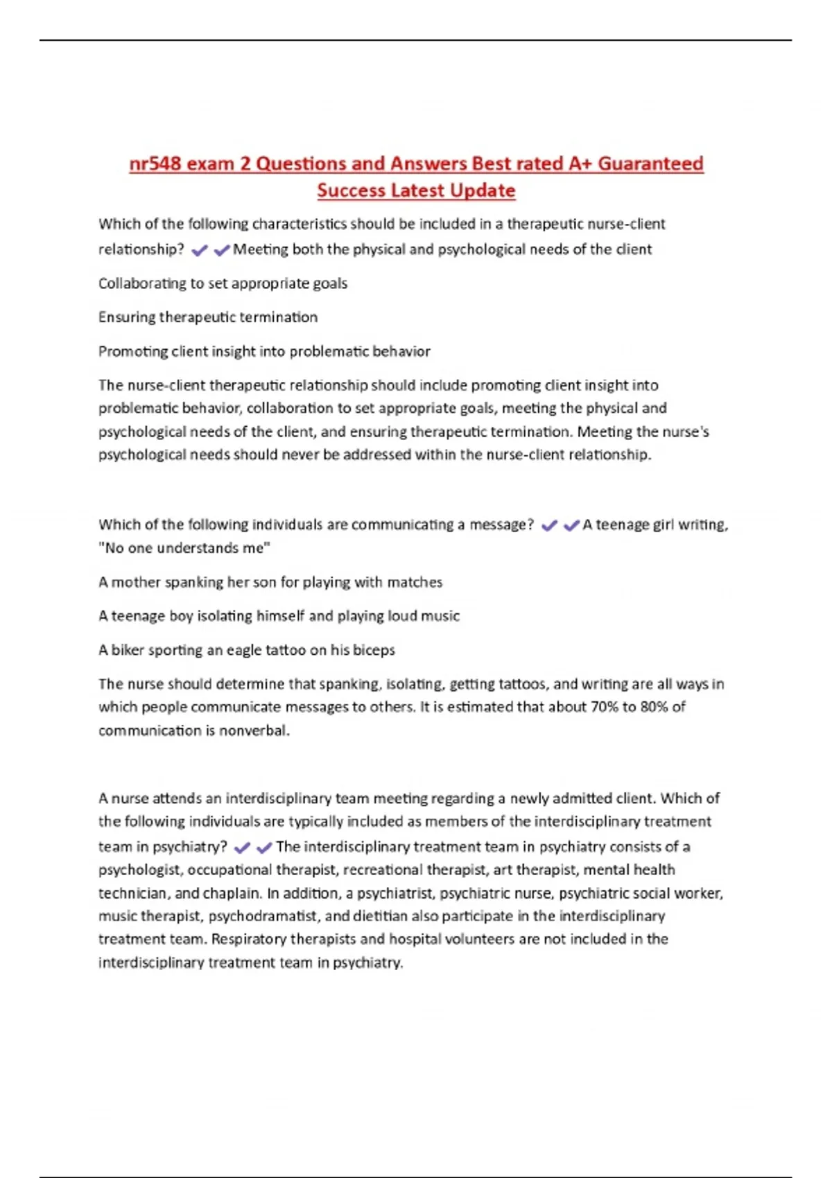 nr548 exam 2 Questions and Answers Best rated A+ Guaranteed Success Latest Update Which of the following characteristics should be included in a therapeutic nurse-client relationship? Meeting both the physical and psychological needs of the client Collaborating to set appropriate goals Ensuring therapeutic termination Promoting client insight into problematic behavior The nurse-client therapeutic relationship should include promoting client insight into problematic behavior, collaboration to set appropriate goals, meeting the physical and psychological needs of the client, and ensuring therapeutic termination. Meeting the nurse's psychological needs should never be addressed within the nurse-client relationship.