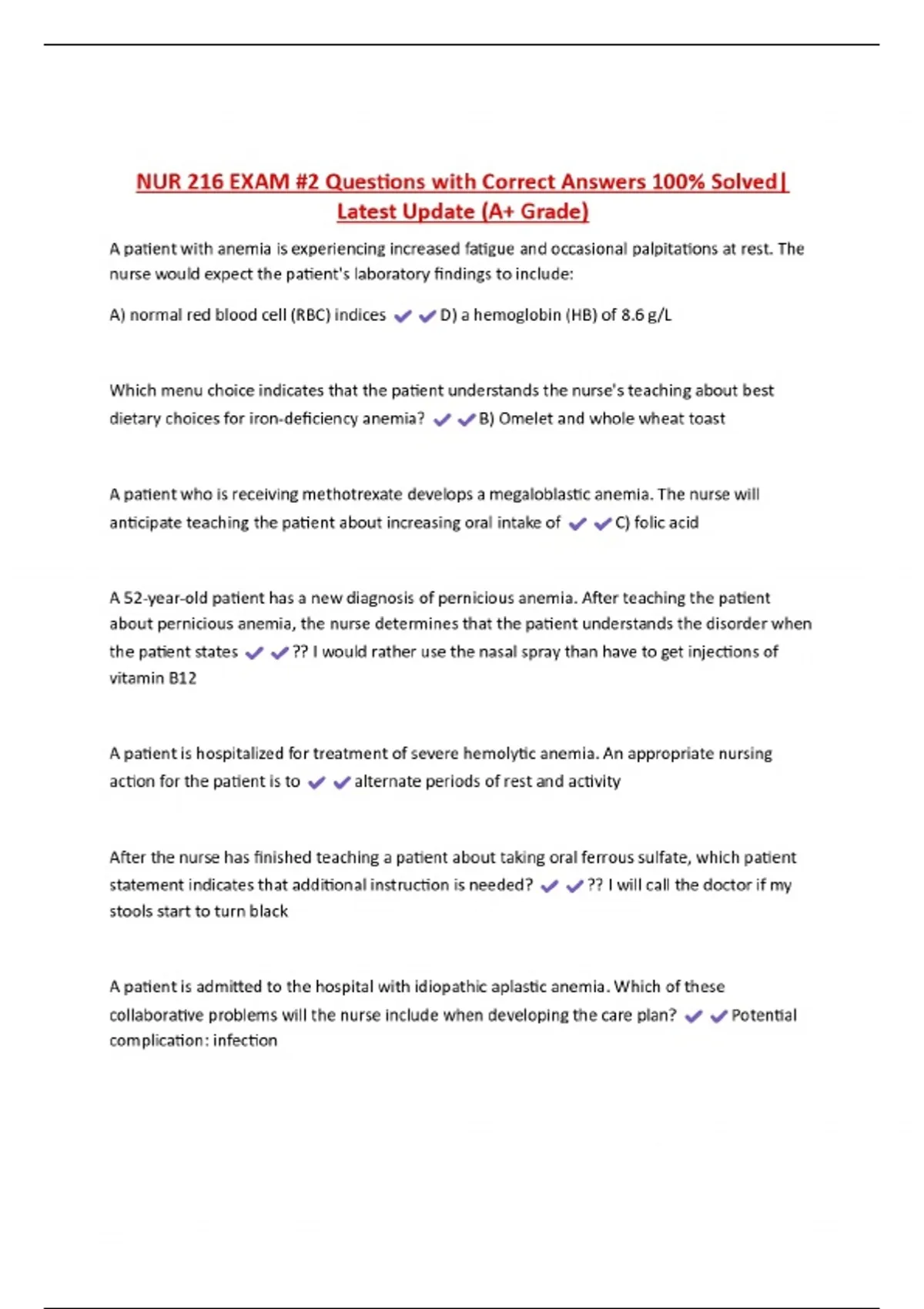NUR 216 EXAM #2 Questions with Correct Answers 100% Solved| Latest Update (A+ Grade) A patient with anemia is experiencing increased fatigue and occasional palpitations at rest. The nurse would expect the patient's laboratory findings to include: A) normal red blood cell (RBC) indices D) a hemoglobin (HB) of 8.6 g/L Which menu choice indicates that the patient understands the nurse's teaching about best dietary choices for iron-deficiency anemia? B) Omelet and whole wheat toast A patient who is receiving methotrexate develops a megaloblastic anemia. The nurse will anticipate teaching the patient about increasing oral intake of C) folic acid