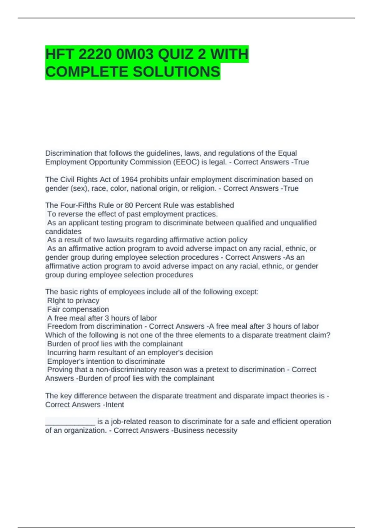 Freedom from discrimination - Correct Answers -A free meal after 3 hours of labor