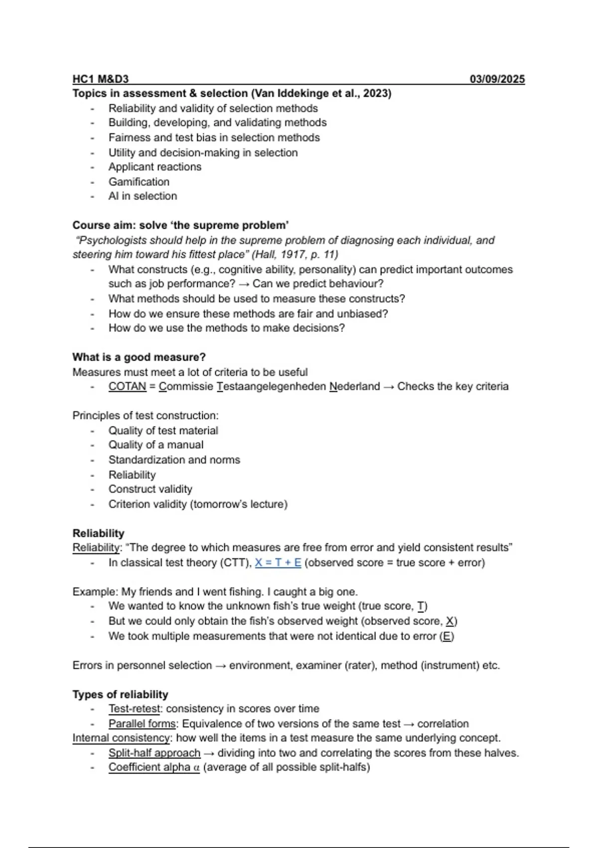 Complete and easy-to-read summary of M&D3 – Assessment & Selection. Covers all lectures, key concepts, and important authors (e.g., Schmidt & Hunter, Sackett et al., Van Iddekinge et al.). Includes topics such as reliability, validity, test construction, job analysis, interviews, assessment centers, fairness, and decision-making. Perfect for students preparing for the exam — all lectures combined into one clear and structured file. I used this summary to prepare for the exam and scored an 8/10!