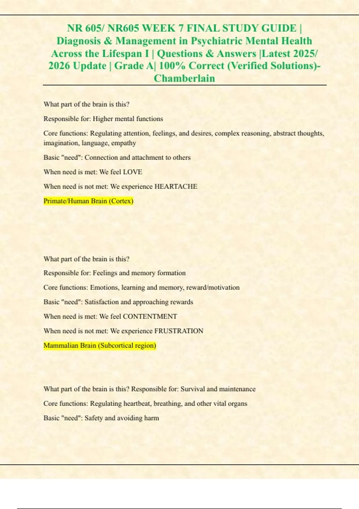 This comprehensive Week 7 Final Study Guide for NR 605: Diagnosis and Management in Psychiatric Mental Health Across the Lifespan I (Chamberlain University, 2025/2026 update) includes all verified questions with 100% correct answers and rationales. It covers essential psychiatric diagnostic and management concepts, including differential diagnosis, therapeutic interventions, psychopharmacology, and lifespan-specific mental health disorders. The guide is designed to prepare PMHNP students for the NR605 final exam with clinically relevant, evidence-based content aligned with current psychiatric nursing practice.