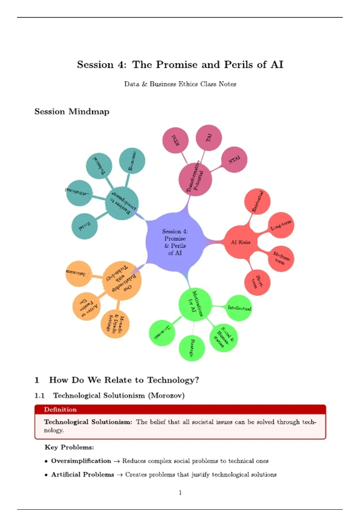 These summaries cover all key topics from a university-level Data and Business Ethics course. Each session provides clear, structured notes that combine theoretical concepts with practical examples, making it ideal for exam preparation or quick revision. Included Sessions: Session 2 – Introduction to Business Ethics: Core ethical principles, frameworks for ethical decision-making, and corporate responsibility. Session 3 – Data and Privacy: Key data protection concepts (GDPR, data ownership, consent) and real-world case studies. Session 4 – Algorithmic Bias and Fairness: Understanding bias in data and AI, ethical implications, and mitigation strategies. Session 5 – Corporate Governance and Data Management: Ethical data governance, accountability, and transparency in business. Session 6 – Emerging Ethical Challenges: AI ethics, automation, and responsible innovation (short summary version). Session 7 – Sustainability and Ethics: Ethical trade-offs between profit, sustainability, and social responsibility. Session 8 – Ethical Leadership: Principles of ethical leadership, stakeholder management, and decision-making in uncertain contexts. Session 9 – Review and Applications: Integration of course themes with practical applications and ethical case analyses. Why it’s valuable: Concise and well-structured – perfect for quick understanding. Covers all essential theories, models, and examples from the course. Helps students prepare for exams, essays, or discussions efficiently. Format: PDF (8 documents) Level: Undergraduate / Master’s (Data, Business, or Management programs) Length: ~40–50 pages total