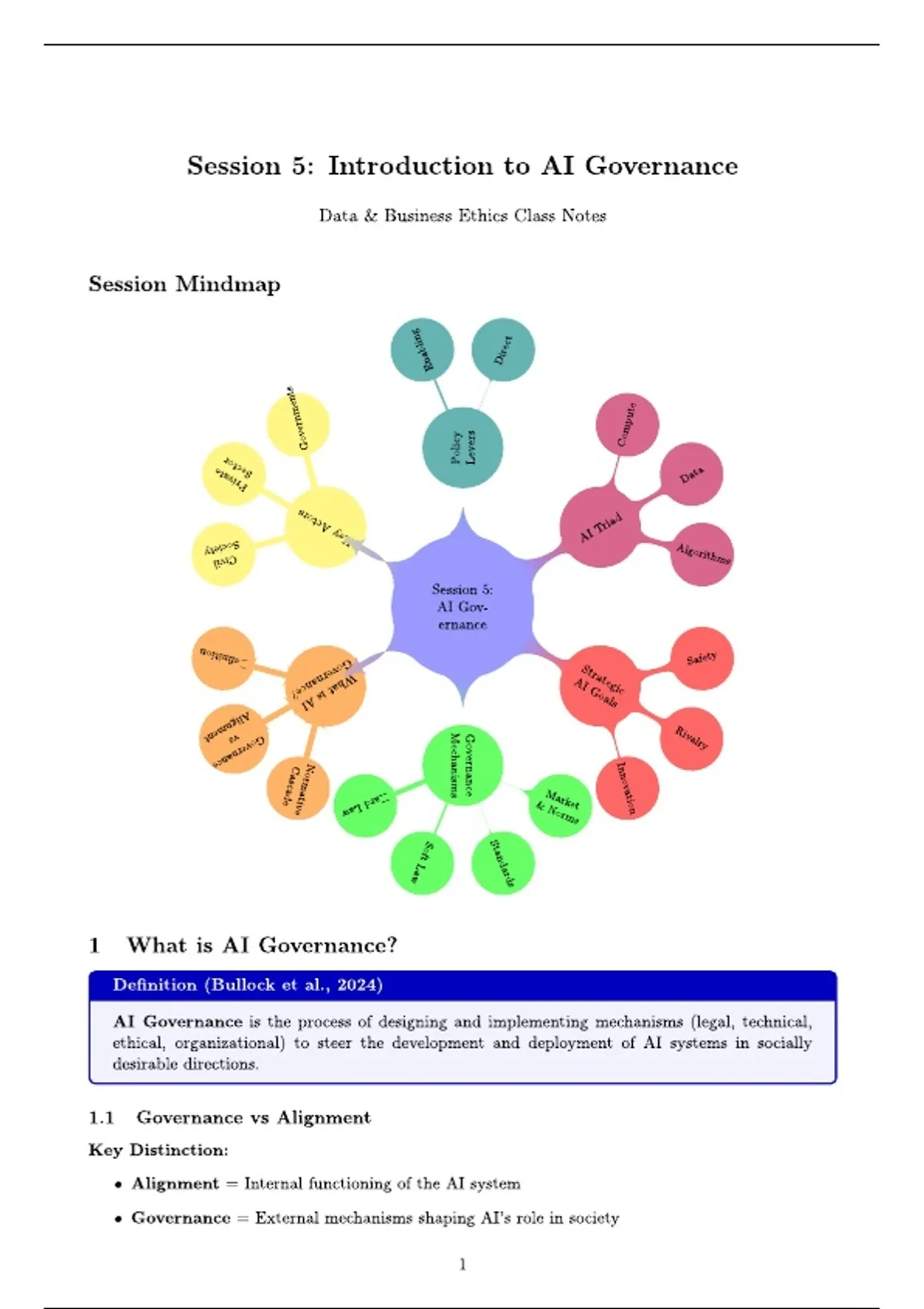 These summaries cover all key topics from a university-level Data and Business Ethics course. Each session provides clear, structured notes that combine theoretical concepts with practical examples, making it ideal for exam preparation or quick revision. Included Sessions: Session 2 – Introduction to Business Ethics: Core ethical principles, frameworks for ethical decision-making, and corporate responsibility. Session 3 – Data and Privacy: Key data protection concepts (GDPR, data ownership, consent) and real-world case studies. Session 4 – Algorithmic Bias and Fairness: Understanding bias in data and AI, ethical implications, and mitigation strategies. Session 5 – Corporate Governance and Data Management: Ethical data governance, accountability, and transparency in business. Session 6 – Emerging Ethical Challenges: AI ethics, automation, and responsible innovation (short summary version). Session 7 – Sustainability and Ethics: Ethical trade-offs between profit, sustainability, and social responsibility. Session 8 – Ethical Leadership: Principles of ethical leadership, stakeholder management, and decision-making in uncertain contexts. Session 9 – Review and Applications: Integration of course themes with practical applications and ethical case analyses. Why it’s valuable: Concise and well-structured – perfect for quick understanding. Covers all essential theories, models, and examples from the course. Helps students prepare for exams, essays, or discussions efficiently. Format: PDF (8 documents) Level: Undergraduate / Master’s (Data, Business, or Management programs) Length: ~40–50 pages total