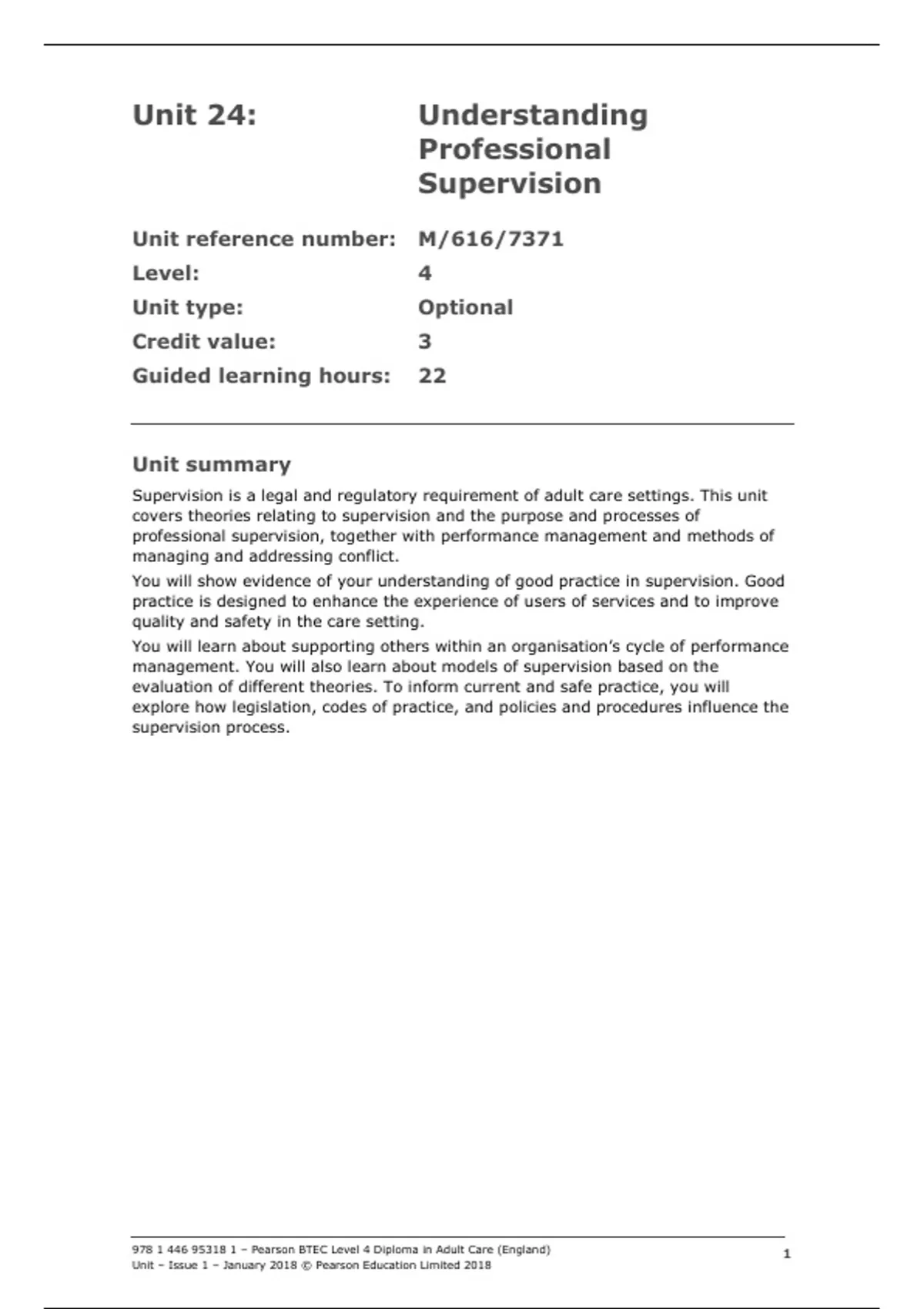 This document provides the full official Pearson BTEC Level 4 Diploma in Adult Care (England) content for Unit 24: Understanding Professional Supervision. It includes all learning outcomes, assessment criteria, and detailed guidance on supervision models, legislation, and performance management. Covers all 4 learning outcomes (LO1–LO4): Theories and models of professional supervision (Rogers, Kadushin, Proctor, etc.) Impact of legislation, codes of practice, and policies Anti-oppressive practice and conflict management Performance management cycle, indicators of poor performance, and SMART objectives Ideal for: Students completing the BTEC Level 4 Diploma in Adult Care or professionals in health and social care supervision roles. Includes: Unit overview and credit details Key models and principles of effective supervision Guidance on governance, safeguarding, and constructive feedback Recommended reading and web resources File type: PDF (7 pages) Qualification: Pearson BTEC Level 4 Diploma in Adult Care Language: English