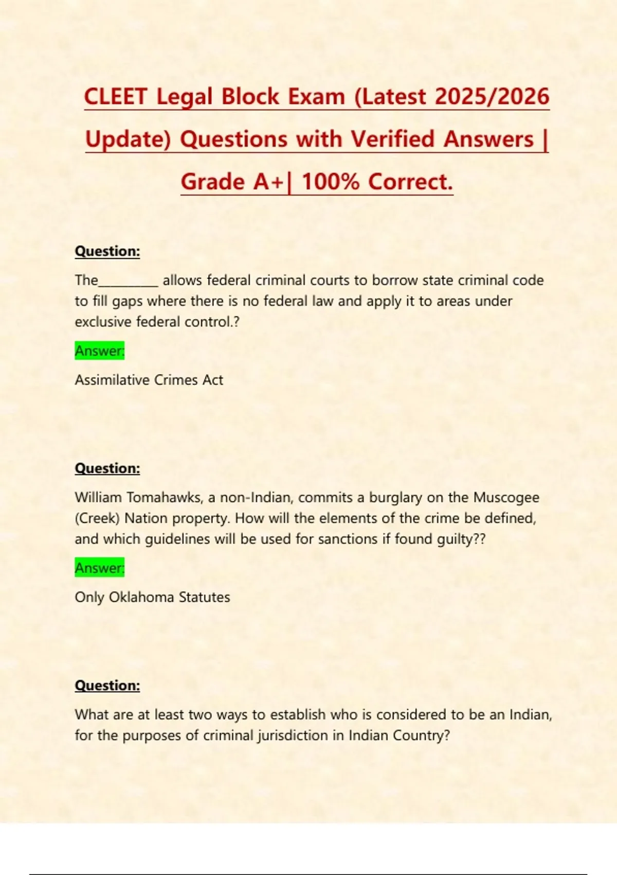 CLEET Legal Block Exam (Latest 2025/2026 Update) Questions with Verified Answers | Grade A+| 100% Correct. CLEET Legal Block Exam (Latest 2025/2026 Update) Questions with Verified Answers | Grade A+| 100% Correct.