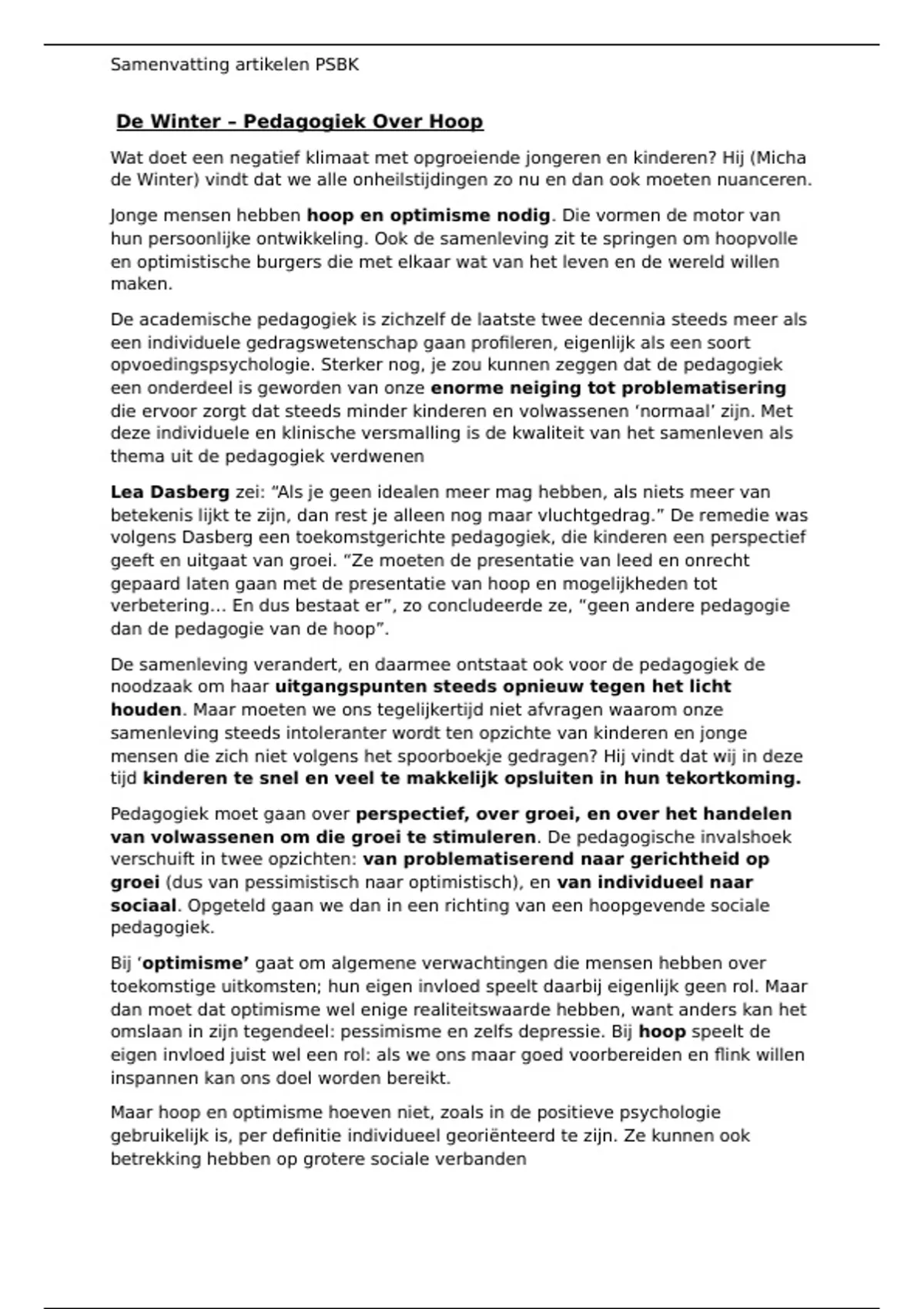 Dit zijn de samenvattingen van de artikelen van de literatuurlijst van psbk : Artikel de Winter, artikel Draper, Oates et al. developing brains, kennisdossier Berenschot H3, SER adviesrapport, artikel Van Huizen & Platenga, artikel Schappin