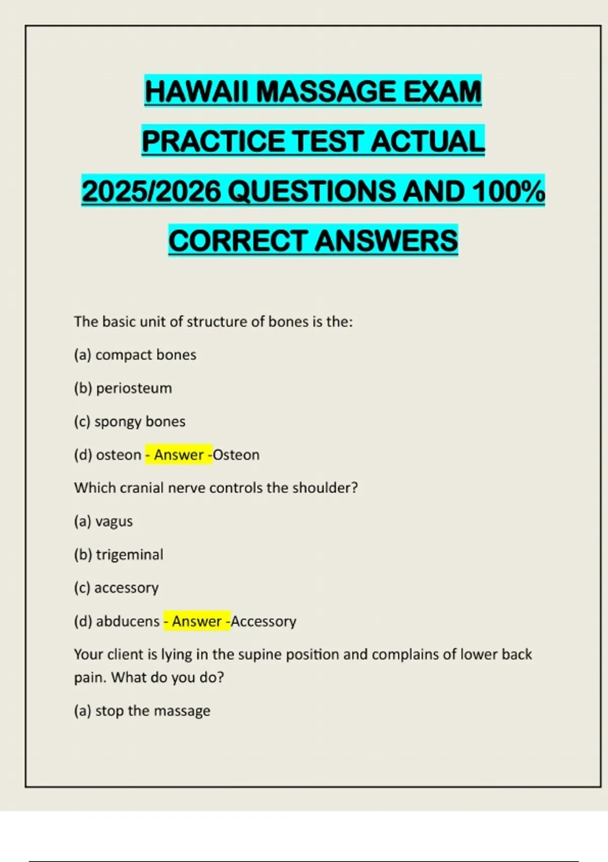 HAWAII MASSAGE EXAM PRACTICE TEST ACTUAL 2025/2026 QUESTIONS AND 100% CORRECT ANSWERS The basic unit of structure of bones is the: (a) compact bones (b) periosteum (c) spongy bones (d) osteon - Answer -Osteon Which cranial nerve controls the shoulder? (a) vagus (b) trigeminal (c) accessory (d) abducens - Answer -Accessory Your client is lying in the supine position and complains of lower back pain. What do you do? (a) stop the massage(b) turn him on his side (c) ask him to relax (d) place a pillow under his knee - Answer -Place a pillow under his knee Which nerve controls the heart and lungs? (a) optic (b) abducens (c) vagus (d) sciatic - Answer -Vagus If your client has HIV, under which circumstances can you refuse treatment? (a) when your client thinks he is infected (b) when you are afraid of being infected (c) only when your client admits he is infected (d) none of the above - Answer -(d) none of the above Which body cavity contains the heart and lungs? (a) thoracic (b) pleural (c) pelvic (d) dorsal - Answer -thoracic What term means the condition of the blood?(a) itis (b) cry (c) oma (d) emia - Answer -emia The suffix "ase" normally indicates a: (a) sugar (b) enzyme (c) carbohydrate (d) abnormal condition - Answer -enzyme Which of the following may lead to the revocation of your license? (a) opening 24 hours without approval (b) not closing the premises for repairs (c) abandoning the premises (d) having too many therapists on duty - Answer -abandoning the premises Which term indicates the use of ice? (a) post (b) circum (c) anti (d) cry - Answer -cryWhich bone connects the tibia, fibula, and the navicular? (a) phalanges (b) digitalis (c) talus (d) calcaneus - Answer -talus If a therapist contracts his/her arm muscles, the manipulation is called: (a) petrissage (b) compression (c) tapotement (d) friction - Answer -petrissage The origin of the Sartorius muscle is: (a) femur (b) ilium (c) ischium (d) pubis - Answer -ilium Which muscle is involved in the plantar-flexion of the foot? (a) pectineus (b) gastrocnemius (c) gracilis (d) tibialis anterior - Answer -gastrocnemius