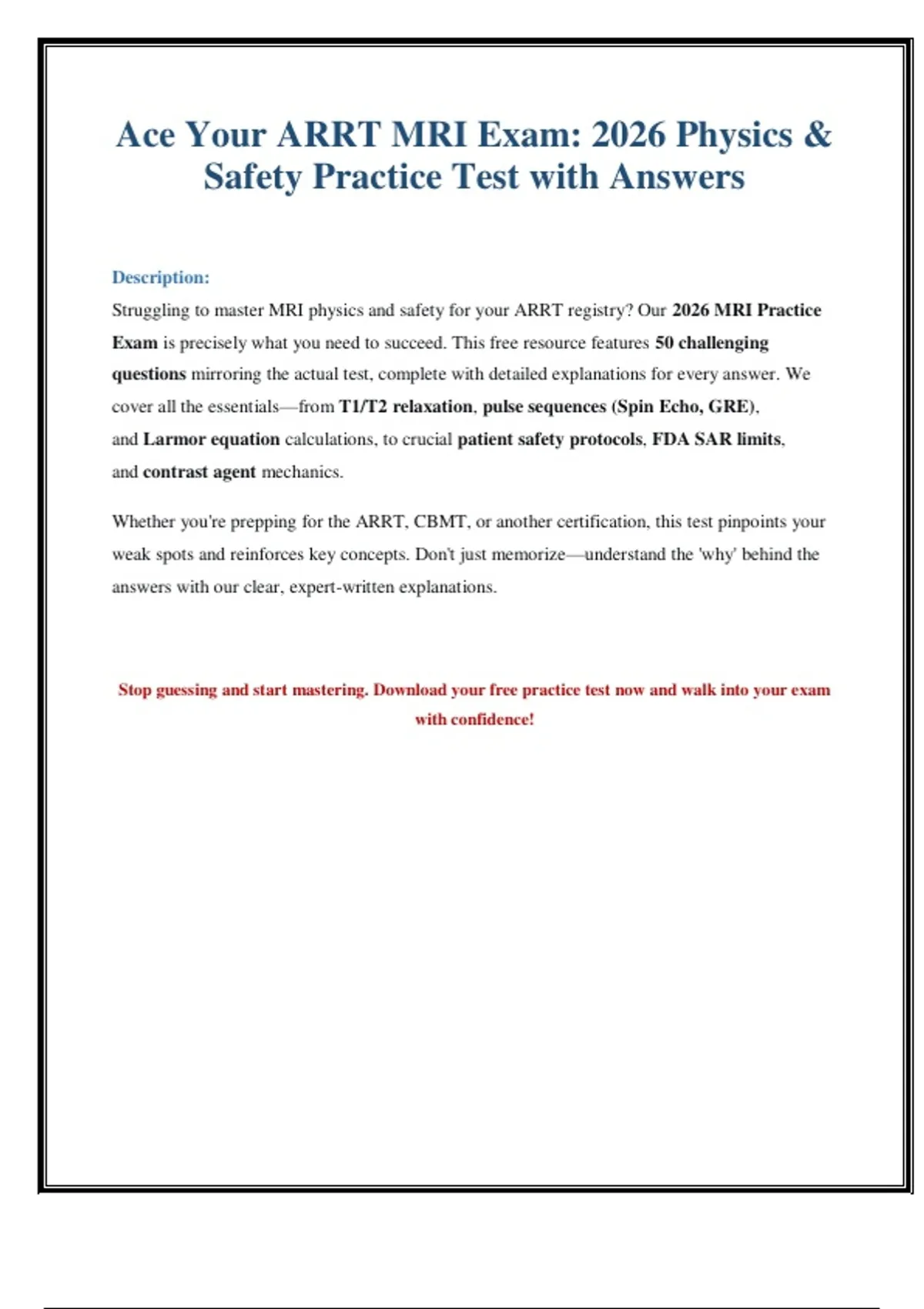 , 2026 MRI Registry Review: Physics & Safety Practice Exam