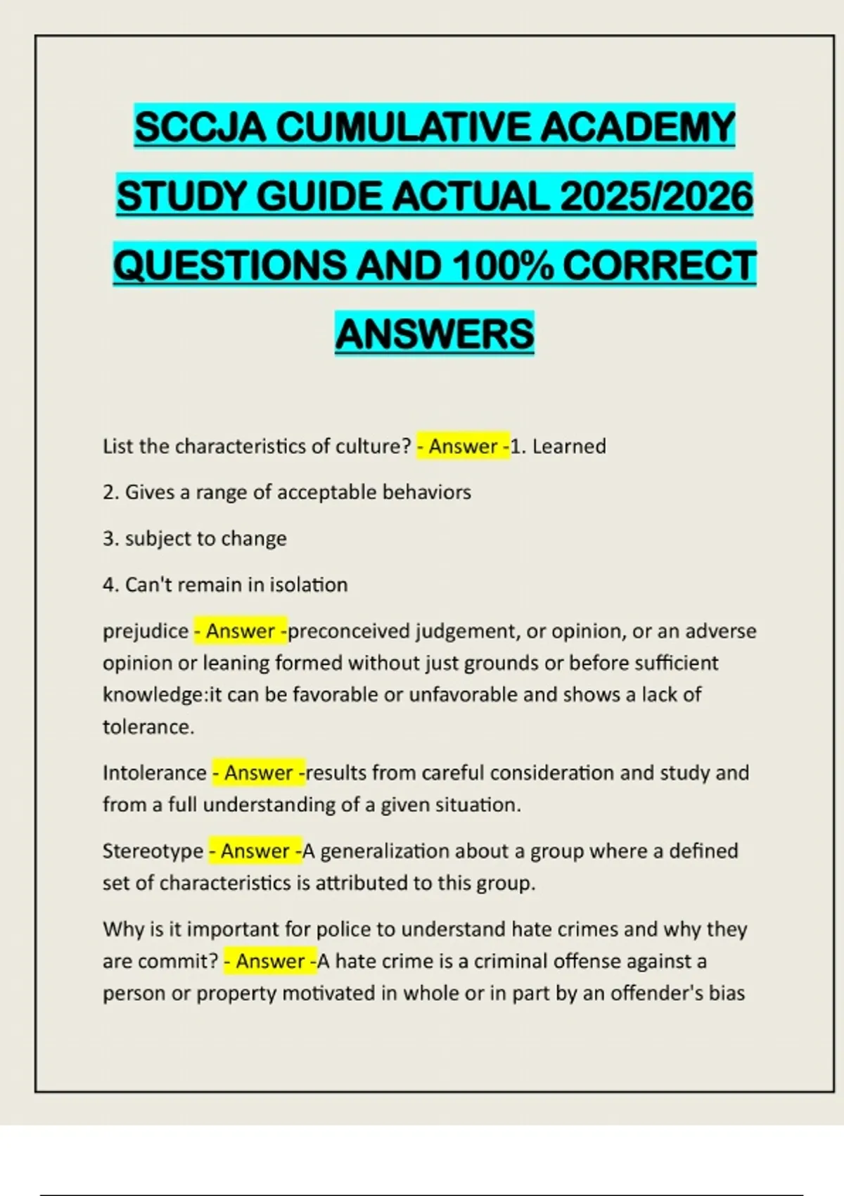 SCCJA CUMULATIVE ACADEMY STUDY GUIDE ACTUAL 2025/2026 QUESTIONS AND 100% CORRECT ANSWERS List the characteristics of culture? - Answer -1. Learned 2. Gives a range of acceptable behaviors 3. subject to change 4. Can't remain in isolation prejudice - Answer -preconceived judgement, or opinion, or an adverse opinion or leaning formed without just grounds or before sufficient knowledge:it can be favorable or unfavorable and shows a lack of tolerance. Intolerance - Answer -results from careful consideration and study and from a full understanding of a given situation. Stereotype - Answer -A generalization about a group where a defined set of characteristics is attributed to this group. Why is it important for police to understand hate crimes and why they are commit? - Answer -A hate crime is a criminal offense against a person or property motivated in whole or in part by an offender's biasagainst a race, religion, disability, ethnic origin, or sexual orientation. Hate crimes are sometimes more brutal when they are committed. Most narcotic deaths are a result of ? - Answer -Respiratory Depression If you neglect a vulnerable adult, what is the maximum prison sentence for this felony? - Answer -5 years If you exploit a vulnerable adult, you can be charged a maximum fine or given a maximum prison sentence. What is the max fine and max sentence? - Answer -$5000.00 or 5 Years What threat level of vest only protects against .22, .25 and .32 caliber weapons? - Answer -Level 1 If a business is robbed, who (name) shall be listed as the victim on the police report? - Answer -Business name: As teaching note - you will also list all of the people who were victims of the robbery as well. Which Generational group has the largest generation in the workforce? Born between - Answer -Baby Boomers Which Generational group has the second largest generation in the workforce? Born between - Answer -Generation X Which Generational group has a strong sense of civic pride? Born between - Answer -Generation Y (Millennials) What 2 elements must an officer prove to charge someone with PWID? - Answer -1. Person possessed the drugs 2. He/she intended distribute the drugsCan "acquaintance" be used on the report if you know the nature of the relationship? - Answer -No - If you know the relationship it should be listed specifically. When a person conforms to group norms because it appears that is what is expected it is called? - Answer -Group prejudice This is known as a popular "date rape" drug? - Answer -Rohypnol or Flunitrazepam - Also known as roofies. If you abuse a vulnerable adult, what is your max prison sentence for this felony? - Answer -5 years What is the most frequently encountered illegal drug worldwide? - Answer -Marijuana If you abuse or neglect a vulnerable adult resulting in great bodily injury, what is your maximum sentence for this felony? - Answer -15 years What is the golden rule when confronted by a uniformed police officer when in plain clothes? - Answer -The uniformed officer is in charge. If a victim is Hispanic, do you list this under race or ethnicity? - Answer - Ethnicity Preconceived judgement or opinion formed without just grounds; can be favorable or unfavorable defines: - Answer -Prejudice A conversation with a purpose designed to obtained and evaluate information given to LE officers by persons who have knowledge of events is defined as? - Answer -Interview