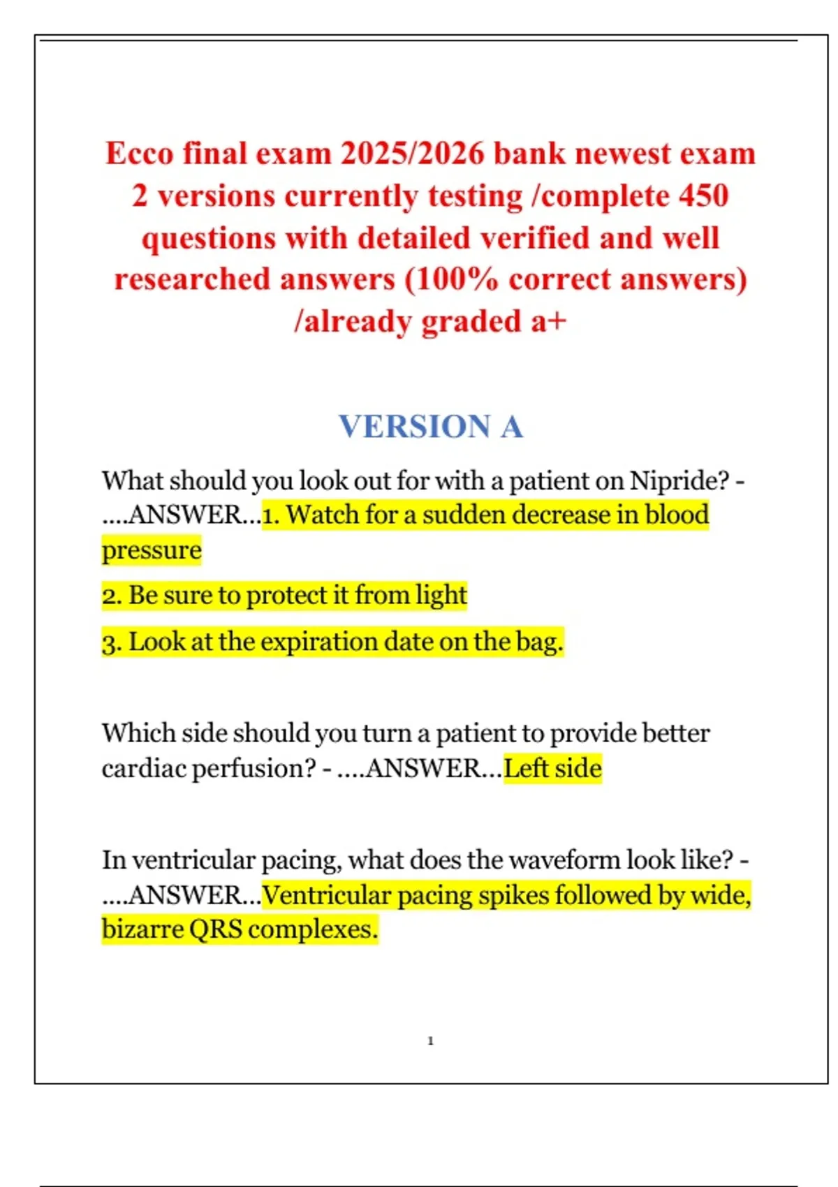 Ecco final exam 2025/2026 bank newest exam 2 versions currently testing /complete 450 questions with detailed verified and well researched answers (100% correct answers) /already graded a+