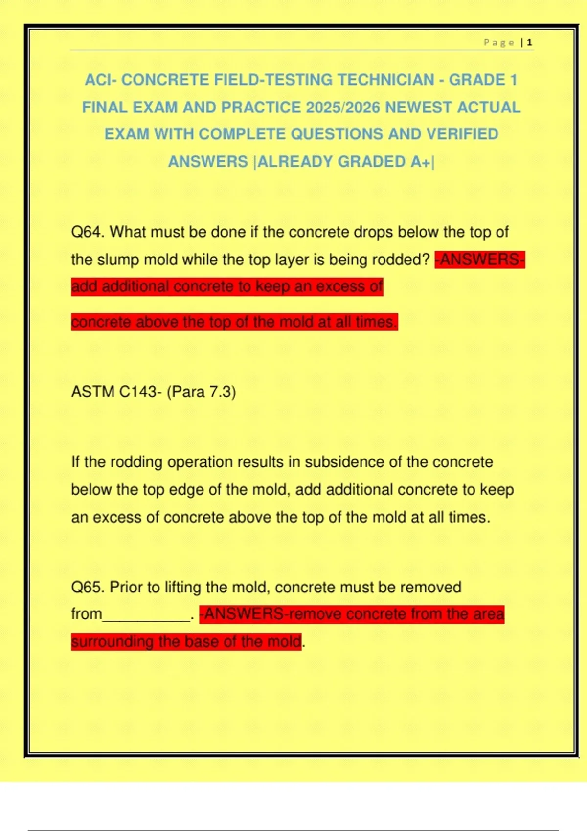 ACI- CONCRETE FIELD-TESTING TECHNICIAN - GRADE 1 FINAL EXAM AND PRACTICE 2025/2026 NEWEST ACTUAL EXAM WITH COMPLETE QUESTIONS AND VERIFIED ANSWERS |ALREADY GRADED A+|
