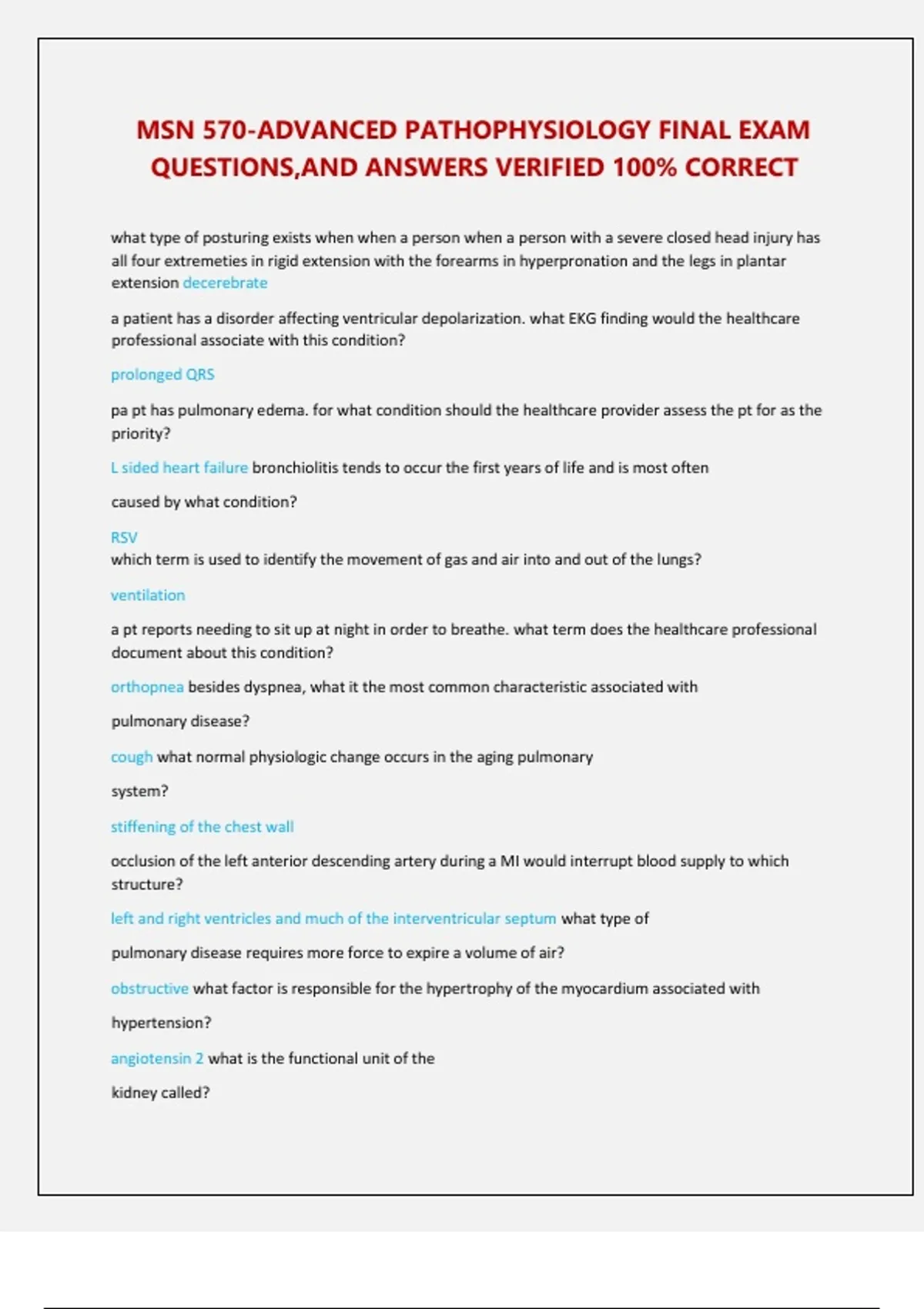 MSN 570-ADVANCED PATHOPHYSIOLOGY FINAL EXAM QUESTIONS,AND ANSWERS VERIFIED 100% CORRECT what type of posturing exists when when a person when a person with a severe closed head injury has all four extremeties in rigid extension with the forearms in hyperpronation and the legs in plantar extension decerebrate a patient has a disorder affecting ventricular depolarization. what EKG finding would the healthcare professional associate with this condition? prolonged QRS pa pt has pulmonary edema. for what condition should the healthcare provider assess the pt for as the priority? L sided heart failure bronchiolitis tends to occur the first years of life and is most often caused by what condition? RSV which term is used to identify the movement of gas and air into and out of the lungs? ventilation a pt reports needing to sit up at night in order to breathe. what term does the healthcare professional document about this condition? orthopnea besides dyspnea, what it the most common characteristic associated with pulmonary disease? cough what normal physiologic change occurs in the aging pulmonary system? stiffening of the chest wall occlusion of the left anterior descending artery during a MI would interrupt blood supply to which structure? left and right ventricles and much of the interventricular septum what type of pulmonary disease requires more force to expire a volume of air? obstructive what factor is responsible for the hypertrophy of the myocardium associated with hypertension? angiotensin 2 what is the functional unit of the kidney called? nephron how many stools per day is considered the upper limits of normal? three bacteria gain access to the female urinary tract by which means? bacteria ascending the urethra into the bladder a patient's urinalysis came back + for glucose. what does the healthcare professional ex[ect the patients blood glucose to be at a minimum? 180mg/dl which hormone is synthesized and secreted by the kidneys? erythropoietin the most common clinical manifestation of portal hypertension is what type of bleeding? esophageal a pt has bleeding of the rectum. How does the healthcare professional document this finding? hematochezia a pt has been admitted for a possible small intestinal obstruction. what is the first sign the healthcare professional assesses for that would indicate the presence of this condition? distension what renal change is found in older adults? decrease in nephrons A healthcare professional reads in the patient's chart and notes the patient has Cheyne-Stokes respirations. What clinical finding would the professional correlate with this condition? d. Crescendo-decrescendo pattern of breathing, followed by a period of apnea A healthcare professional advises a pregnant woman to add supplements of which nutrient to her diet to prevent birth defects? folate When comparing the effects of acute and chronic pain on an individual, chronic pain is more often what? a factor that contributes to depression Rhabdomyosarcoma can develop in which type of muscle? striated A herniation of which disk will likely result in motor and sensory changes of the lateral lower legs and soles of the feet? L5 to S1 Clinical manifestations of posterolateral protrusions include radicular pain exacerbated by movement and straining (medial calf suggests L5; lateral calf suggests S1 root compression). L2 to L3 herniation would result in radicular pain in the anterior middle thigh and knee. L3 to L5 would manifest as pain in the knee and the bilateral calf. An S2 to S3 herniation would be characterized with pain on the upper posterior thigh going down to the distal portion of the calf, just proximal to the ankle. What is the tear in a ligament referred to as? sprain Ligament tears are commonly known as sprains. A fracture is a break in a bone. A strain is an injury to a tendon or muscle. Disunion is when bones do not heal together properly after a fracture. What does the student learn about the pain experienced with Legg-Calvé-Perthes disease? Knee, inner thigh, and groin pain is aggravated by activity and relieved by rest Which would be considered a positive symptom of schizophrenia? Auditory hallucinations Positive symptoms frequently occur during a psychotic episode, when an individual loses touch with reality and experiences something that should be absent (e.g., hallucinations). The remaining options are classified as negative symptoms. How does angiotensin II increase the workload of the heart after a myocardial infarction (MI)? By increasing the peripheral vasoconstriction What is the initial manifestation of aortic coarctation observed in a neonate? Heart failure (HF) What is the trigger for angina pectoris? Myocardial ischemia Kussmaul respirations as a respiratory pattern may be associated with which characteristic(s)? Slightly increased ventilatory rate, large tidal volumes, and no expiratory pause Where in the lung does gas exchange occur?