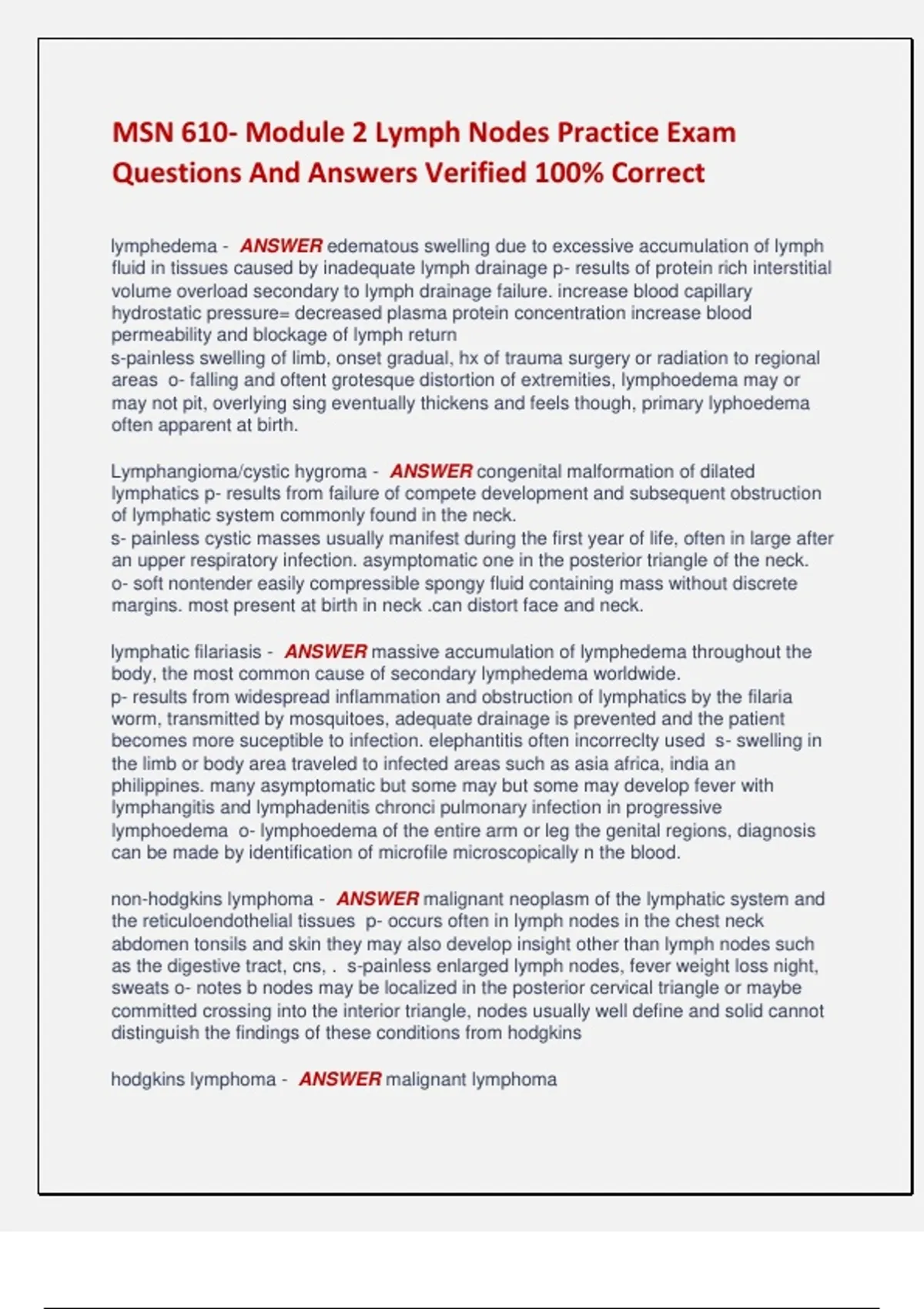 MSN 610- Module 2 Lymph Nodes Practice Exam Questions And Answers Verified 100% Correct lymphedema - ANSWER edematous swelling due to excessive accumulation of lymph fluid in tissues caused by inadequate lymph drainage p- results of protein rich interstitial volume overload secondary to lymph drainage failure. increase blood capillary hydrostatic pressure= decreased plasma protein concentration increase blood permeability and blockage of lymph return s-painless swelling of limb, onset gradual, hx of trauma surgery or radiation to regional areas o- falling and oftent grotesque distortion of extremities, lymphoedema may or may not pit, overlying sing eventually thickens and feels though, primary lyphoedema often apparent at birth. Lymphangioma/cystic hygroma - ANSWER congenital malformation of dilated lymphatics p- results from failure of compete development and subsequent obstruction of lymphatic system commonly found in the neck. s- painless cystic masses usually manifest during the first year of life, often in large after an upper respiratory infection. asymptomatic one in the posterior triangle of the neck. o- soft nontender easily compressible spongy fluid containing mass without discrete margins. most present at birth in neck .can distort face and neck. lymphatic filariasis - ANSWER massive accumulation of lymphedema throughout the body, the most common cause of secondary lymphedema worldwide. p- results from widespread inflammation and obstruction of lymphatics by the filaria worm, transmitted by mosquitoes, adequate drainage is prevented and the patient becomes more suceptible to infection. elephantitis often incorreclty used s- swelling in the limb or body area traveled to infected areas such as asia africa, india an philippines. many asymptomatic but some may but some may develop fever with lymphangitis and lymphadenitis chronci pulmonary infection in progressive lymphoedema o- lymphoedema of the entire arm or leg the genital regions, diagnosis can be made by identification of microfile microscopically n the blood. non-hodgkins lymphoma - ANSWER malignant neoplasm of the lymphatic system and the reticuloendothelial tissues p- occurs often in lymph nodes in the chest neck abdomen tonsils and skin they may also develop insight other than lymph nodes such as the digestive tract, cns, . s-painless enlarged lymph nodes, fever weight loss night, sweats o- notes b nodes may be localized in the posterior cervical triangle or maybe committed crossing into the interior triangle, nodes usually well define and solid cannot distinguish the findings of these conditions from hodgkins hodgkins lymphoma - ANSWER malignant lymphoma p-painless enlarged lymph nodes; may have abdominal pain, sometimes fever may have a history of infectious mononucleosis a o- abdominal pain, fever, cervical lymph nodes o enlargement. asymmetrical and progressive. nodes sometimes matted and firm. Ebstien barr - ANSWER infectious mononucleosis p-initially infects oral epithelial cells after intracellular viral replication and cell ysis with release of new virus spreads to contagious structure such as a salary glands. s-fatigue, acute prolong fever, HA sore throat , nausea, abdominal pain and myalgia, prodromal o-lymphoedema for cervical nodes at vetro clear . mononucleosis, hepatomegaly symptomatic hepatitis or jaundice is uncommon but elevated lens liver enzymes are common splenomegaly two to three cm. below the coastal margins is typical massive enlargement. toxoplasmosis - ANSWER zoonosis p- ingestion or inhaltion of ooh site and solemn slash foam might undercooked meat or raw eggs cate, fces. sub- go significant systems, history of eating raw or rare meat or undercooked eggs history or direct contact with cast cat fecess o- single nodes chronically enlarged and no pender nodes I usually in the posterior cervical chain Roseolo infrantum - ANSWER infection by human herpesevirus 6 p-virus presents in saliva and most adults and is readily transmitted by oral secretion causes life long infection of the host have latent and recurrent infections and cirus shedding occurs at intervals throughout life s- fever is usualy high grade an dpersistent for three to foru days sometimes associated with mild respiratory illness o- a dental pathy discreet and nontender involves occipital and postauricular chain and may last for some time. whene the fever finishes fine maculopapular rash spreading to the trunk herpes simplex - ANSWER p- transmitted by oral secretion genital secretion and clsoe contact can have latent infections and reactivation s-burning itching lesions, may report large lymph nodes o-discrete label and gingival vesicles of ulcers may have enlargement of anterior cervical and submandibular nodes, these nodes tend to be somewhat firm and quite discrete Cat scratch - ANSWER common cause of suvacute and chronic lymphadenitis in children p-caused by Bartonella henselae and bartonella clarridgeia s- right scratch or wound from cat inclusion lesions papular pustular last three to five days then becomes a vesicle and two to three painful and large lymph nodes o- inoculation lesion may be healing, lymph adenopathy develops in one to two weeks, single lymph node most often but multiple nodes are involved occasionally. tender nodes, only in the head, neck, axillae and accessible nodes areas nodes can be very large up to several centimeters HIV - ANSWER p- dysfunction of cell mediated immunity, aids manifested clinically as development of recurrent opportunistic infections s- enlarged lymph nodes, initially symptoms include fever, weakness, persistent unexplained weight loss, and persistent diarrhea o- during generalized lymphadenopathy and children there may be prolonged clinical latent . serum sickness - ANSWER immune complex disease p- type 3 systemic hypersensitivity rx in response to antigens, mediated by tissue deposits of circulating immune complexes a patient can react similarly to repeated exposure to stimuli. s- enlarged