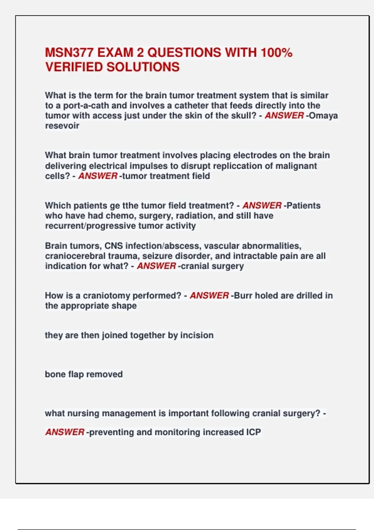 MSN377 EXAM 2 QUESTIONS WITH 100% VERIFIED SOLUTIONS What is the term for the brain tumor treatment system that is similar to a port-a-cath and involves a catheter that feeds directly into the tumor with access just under the skin of the skull? - ANSWER -Omaya resevoir What brain tumor treatment involves placing electrodes on the brain delivering electrical impulses to disrupt repliccation of malignant cells? - ANSWER -tumor treatment field Which patients ge tthe tumor field treatment? - ANSWER -Patients who have had chemo, surgery, radiation, and still have recurrent/progressive tumor activity Brain tumors, CNS infection/abscess, vascular abnormalities, craniocerebral trauma, seizure disorder, and intractable pain are all indication for what? - ANSWER -cranial surgery How is a craniotomy performed? - ANSWER -Burr holed are drilled in the appropriate shape they are then joined together by incision bone flap removed what nursing management is important following cranial surgery? - ANSWER -preventing and monitoring increased ICP -BP control -POsiiton: HOB elevated 30 Frequent neuro checks (Q1) Close monitoring of electrolytes and fluids Monitor Urine output: risk for DI -Admin Vasopressin Sterile wound care Monitor for clear drainage from surgical site: important to test for CSF N/V management Pain management What is a primary spinal cord injury? - ANSWER -Cord compression by bone displacemnts, interruption of blood supply, or traction. Direct stretching or laceration to the sinal cord What is a secondary spinal cord injury? - ANSWER -Ongoing progressive damage after the primary injury. Ongoing ischemia, hypoxia, hemorrhage, and edema Can take weeks or months to develop What is an important consideration regardikng ischemia to the spinal cord that is different than ischemia to other tissues/organs? - ANSWER -Spinal cord has minimal ability to adapt to ischemia What is the term for the temporary loss of rensation, reflexes, thermoregulation, and flaccid paralysis below the level of injury in an individual with an acute spinal cord injury? How long can this temorary stunning of the spinal cord last? - ANSWER -Spinal shock Can last days to weeks What is the term for the state of hemodynamic instability with loss of SNS stimulation that results from and acute spinal cord injury? - ANSWER -Neurogenic shock How does neurogenic shock occur? - ANSWER -Acute spinalcord injury results in loss of SNS stimulation. this allows the PNS to funciton unopposed leading to: -MASSIVE periferal vasodilation, leading to decreased tissue perfusion